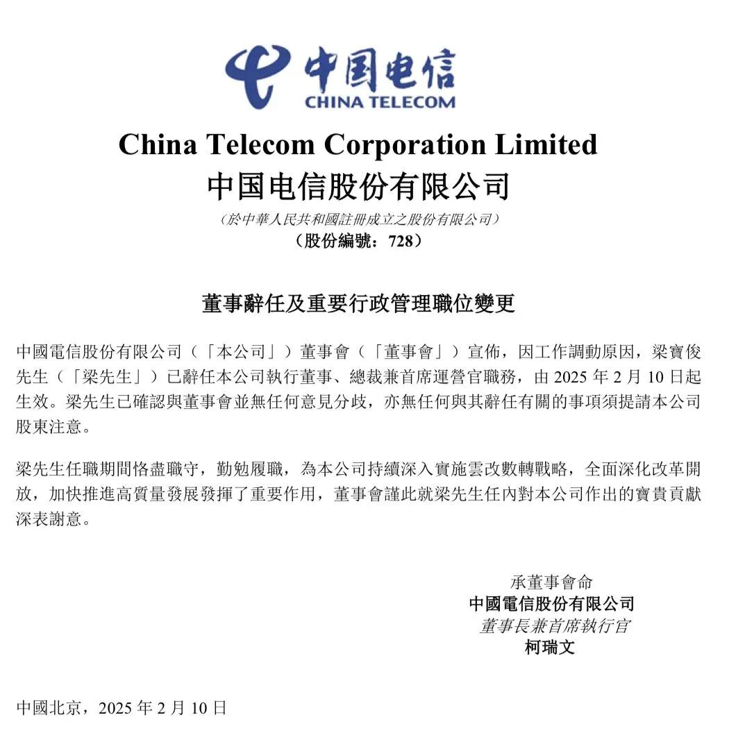 2月10日,中国电信发布公告称,因工作调动原因,梁宝俊先生辞任本公司执行董事、总裁兼首席运营官职务,于2025年2月10日起生效。