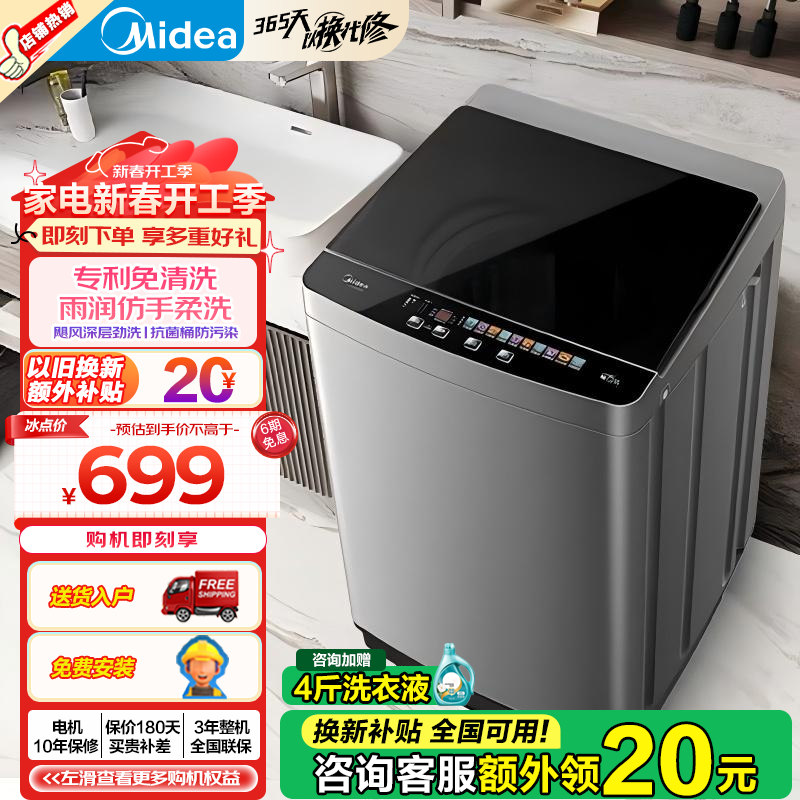 智能大容量美的MB90V39E洗衣机:9公斤洗涤,便捷预约,省心免清洗,699元起