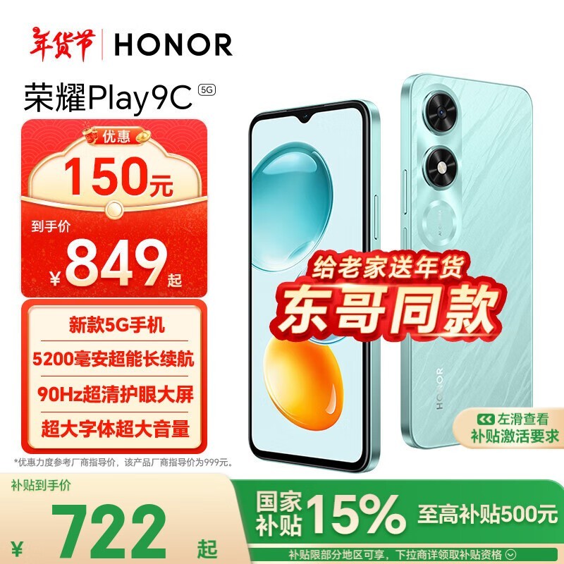 荣耀 Play9C 5G 手机 专为游戏体验设计 实付722元