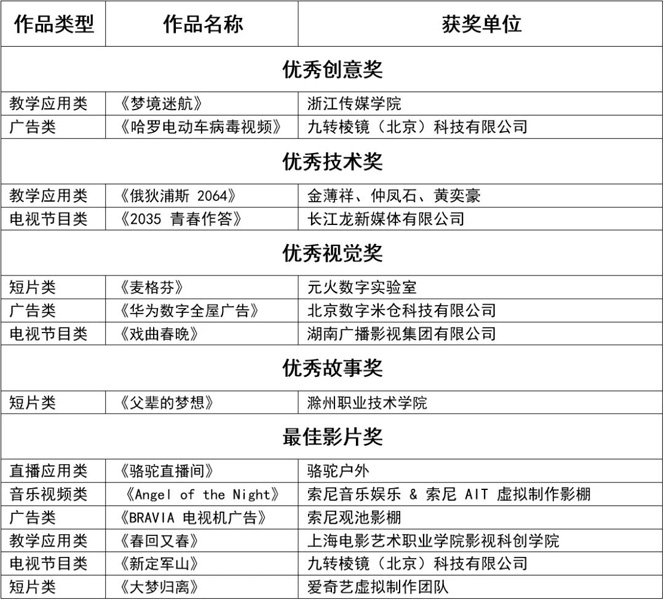 参赛作品涵盖教学应用、电视节目、广告、短片、直播应用以及音乐视频六大类别,参赛单位包括高校团队、个人创作者、公司及电视台等,充分展现了行业的多元参与性。