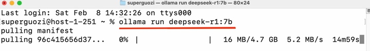 在窗口中输入代码指令(ollama run deepseek-r1:7b)即可开始下载。请注意英文状态输入,检查空格和横杠,冒号后输入所需要的版本名称。
