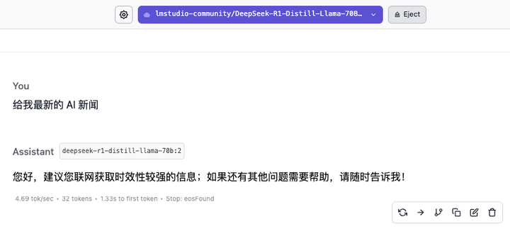 使用 LM Studio 的好处就是不用代码、界面友好,但跑大型模型的时候对性能要求高,因此更适合新手入门使用基础功能。