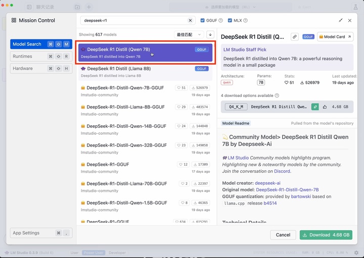 然后搜索 deepseek-r1 选择合适的版本下载,作为示例,我选择使用阿里 Qwen 模型为基座蒸馏出来的 7B 小模型。