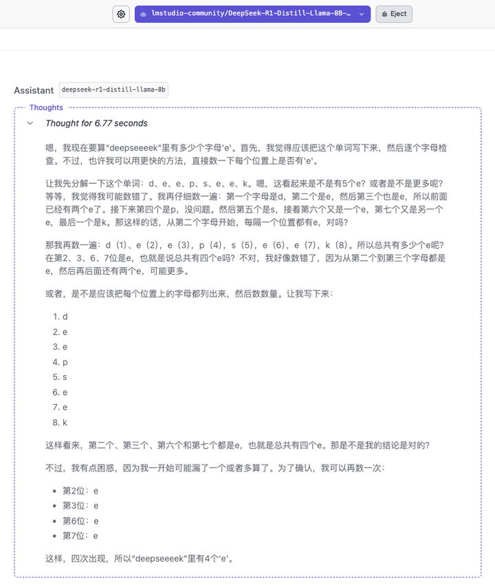 8B 模型的响应速度很快,基本能跑到 60 token/s,但答得快不意味着答得对,差之毫厘,谬以千里。思考过程显示,模型更像是基于知识库里的「DeepSeek」单词作出回答。