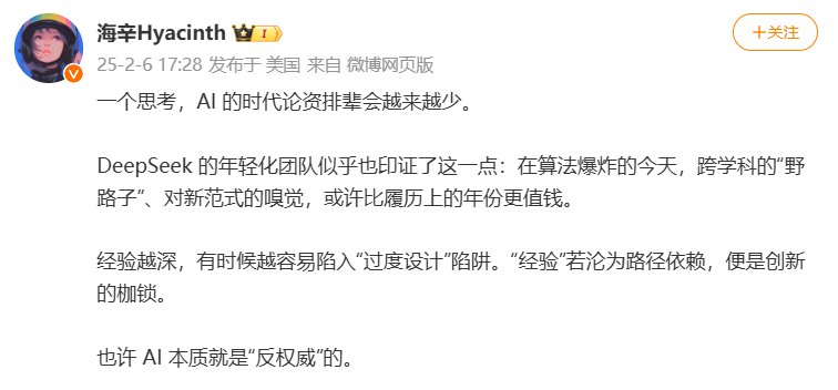@海辛Hyacinth 则从团队管理的角度,认为DeepSeek 的年轻化团队意味着AI时代论资排辈会越来越少……