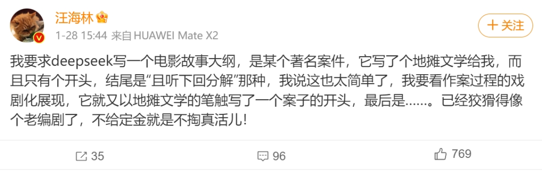 比如编剧@汪海林,探讨基于推理模型的AIGC,给剧本创作带来的颠覆;博主@零重力瓦力,用“AI解题像学霸写作业”类比大模型思维链,让推理模型不再是悬浮的概念,成了人人可上手的工具。