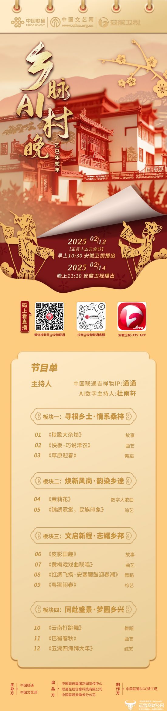 万家灯火闹元宵,千里江山寄平安!继由中国文艺网与中国联通主办的以“非遗乡俗”为题材的AIGC网络村晚——《乡脉·AI村晚》首播后,安徽卫视将于2月12日(正月十五)10:30播出「《乡脉·AI村晚》元宵篇」,延续乡情乡韵,共庆团圆佳节。