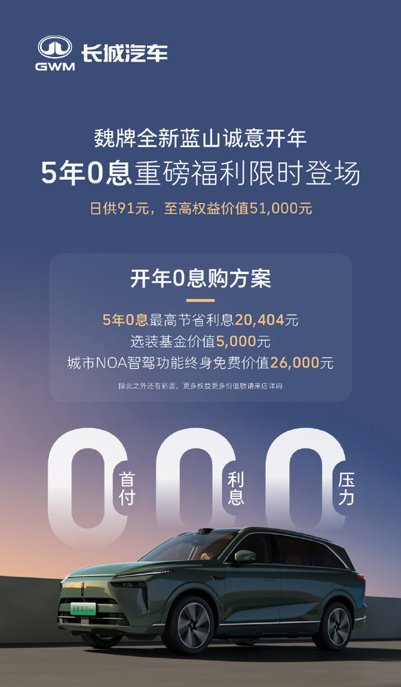 2月11日晚,长城汽车旗下魏牌新能源宣布,自2月13日起至2月28日,旗下车型全新魏牌蓝山推出5年0息重磅福利,日供仅91元,同时还能享至高价值5.1万元权益,包括5年0息最高节省利息20404元、选装基金价值5,000元、城市NOA智驾功能终身免费价值26000元。