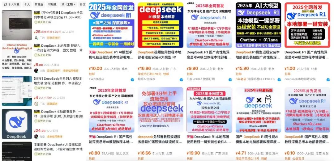 本地部署指的是帮用户将DeepSeek模型下载到电脑上,用电脑显卡进行推理。在淘宝、小红书、闲鱼等平台上都可以看到相关商品,商家会提供安装包、安装教程、使用说明等服务或文档,价格从0.01元到1599元不等。