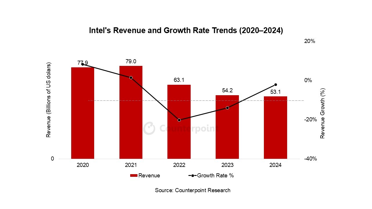 英特尔的收入下滑表明,它在核心CPU市场的主导地位正在受到侵蚀,而个人电脑行业的停滞不前和来自AMD的日益激烈的竞争加剧了这一局面。AMD的最新处理器在性能、能效和成本效益方面往往与英特尔相当,甚至超过英特尔,这进一步削弱了英特尔的市场地位。2015年至2024年,英特尔在客户端和服务器CPU市场的份额从80%暴跌至60%左右。
