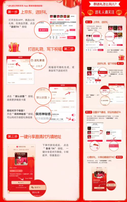 想要送礼的消费者只要打开京东APP挑选自己心仪的3C数码产品,在商品页面点击“送给TA”按钮,在送礼寄语处填写自己的祝福和心意,随后点击“默认封面”按钮,选择更多精美卡面,想要给对方惊喜,还可以开启“保持神秘感”按钮,向对方保密礼物信息。完成上述准备后,仅需一键分享邀请对方填写地址,下单付款后点击“告诉TA”按钮,即可一键分享至对方微信,让对方收到惊喜!收到惊喜礼物的用户也可点击“选好礼回赠”按钮,实现心意的双向传递。