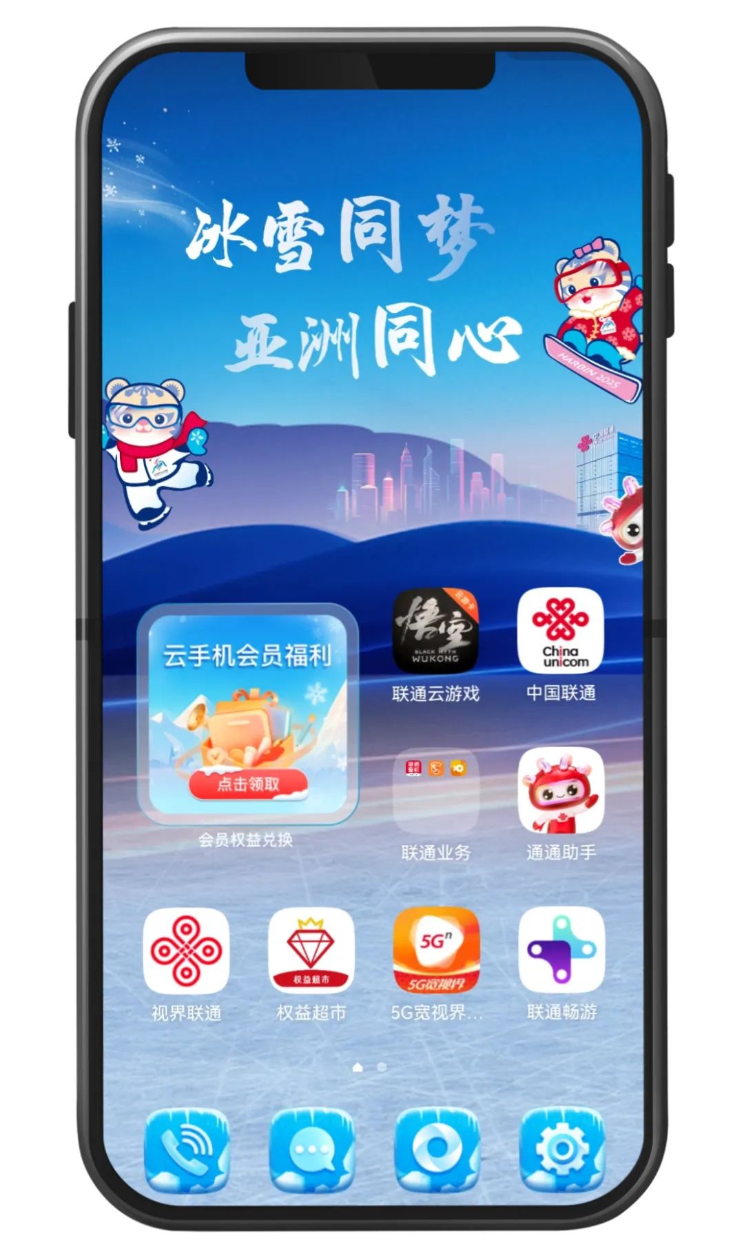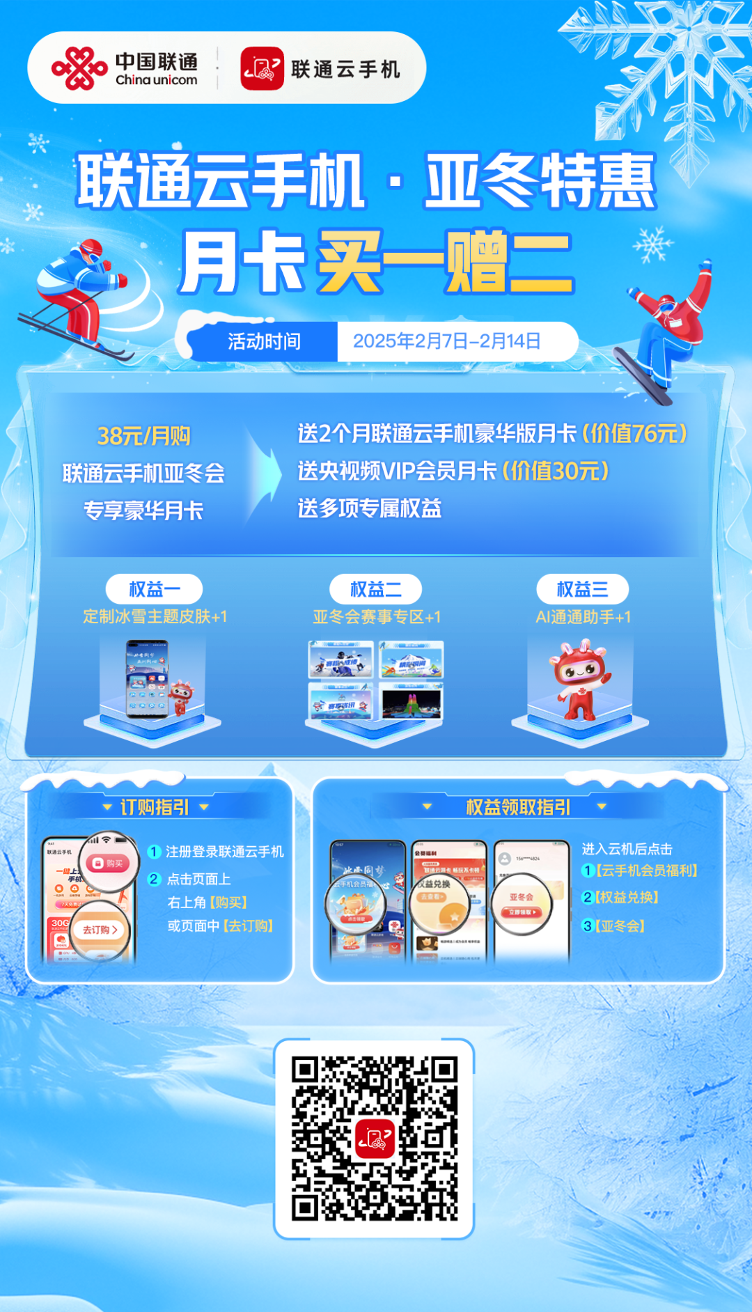 现在起购买联通云手机亚冬会专享豪华月卡(38元/月),即赠送2个月豪华版月卡(价值76元)+央视频VIP月卡(价值30元)+AI不限量特权,同时还能享受多项专属权益,包括定制冰雪主题皮肤、亚冬会赛事专区访问权限以及AI通通助手服务。