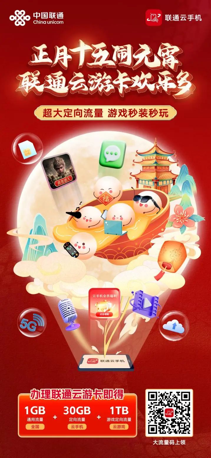 联通云游卡携元宵专属惊喜登场。办理即得1GB全国通用流量、30GB云手机定向流量和1TB云游戏定向流量。畅享超大定向流量,游戏秒装秒玩,摆脱卡顿束缚。这个元宵,让联通云游卡陪你尽情嗨玩,扫描海报二维码速办,开启畅爽云游之旅!