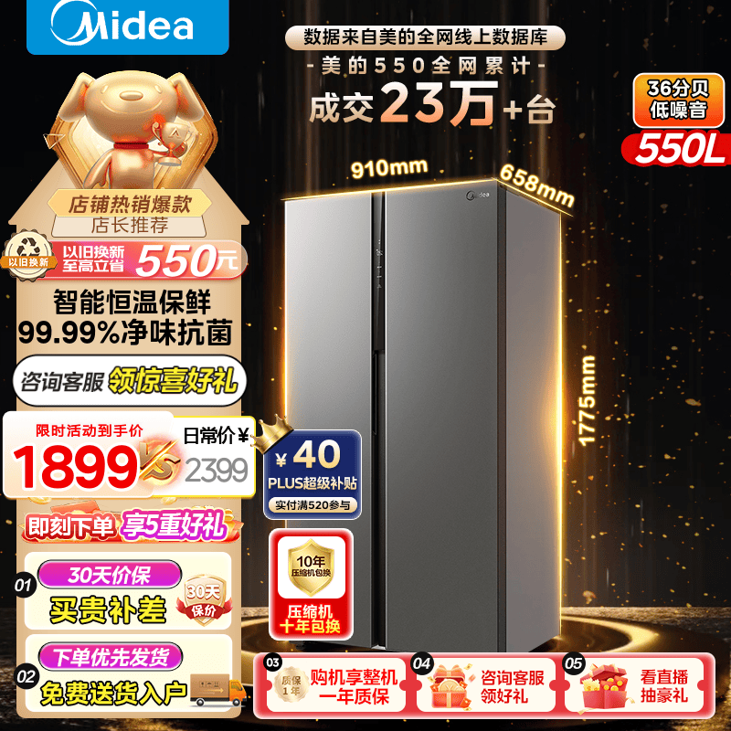 美的BCD-550WKPZM(E)对开门冰箱,活动售价仅需1486元!