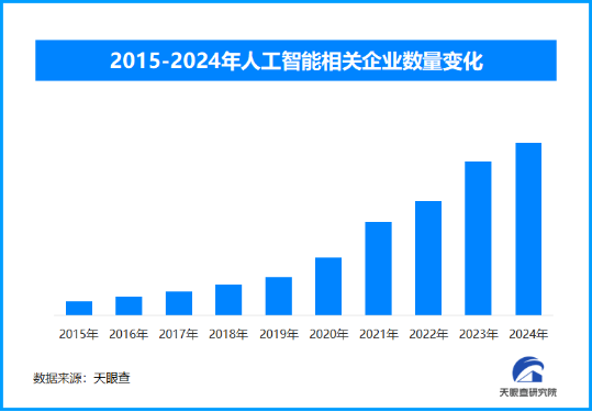 天眼查专业版数据显示,截至目前我国现存在业、存续状态的人工智能相关企业超403.3万家。其中,2024年截至目前新增注册相关企业约91.1万余家,从企业注册数量趋势来看,近十年间,人工智能相关企业的注册数量呈现出逐年增长的态势,并在2024年达到顶峰。