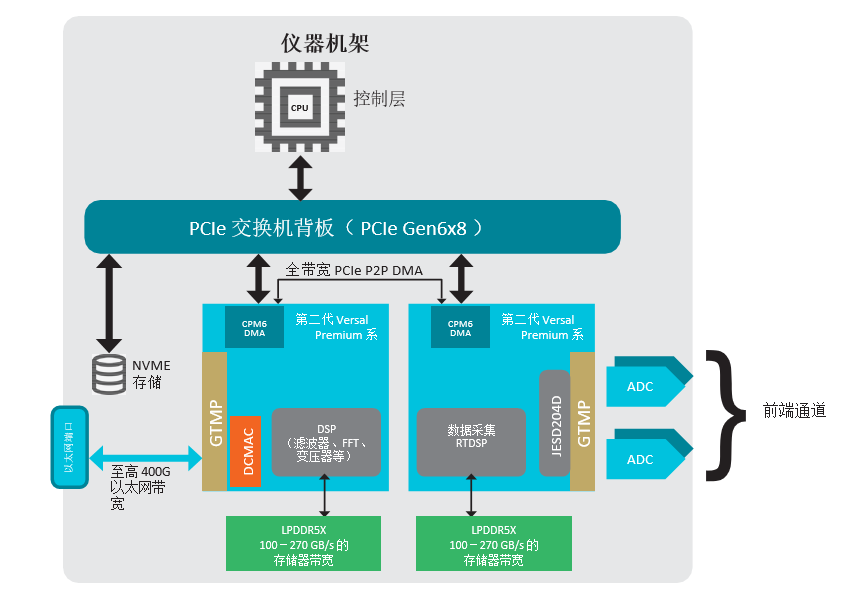 下一代仪器设备(如示波器、分析仪、信号源和生成器)支持跨不同类型端点的主机至器件、器件至主机以及对等通信。考虑到连接水平,就需要 PCIe® 背板上的高 I/O 带宽来支持增加的通道带宽和通道数量。由于测试人员青睐于更多通道和更高采样率,因此就需要更高的 DSP 计算密度。这些需求推动了对更高存储器带宽的需求,从而支持 DDR、LPDDR5X 和 LPCAMM 等不同类型的存储器器件。