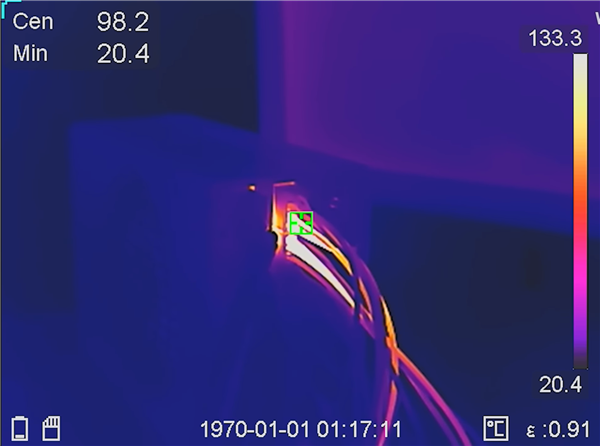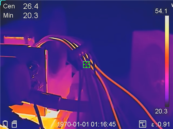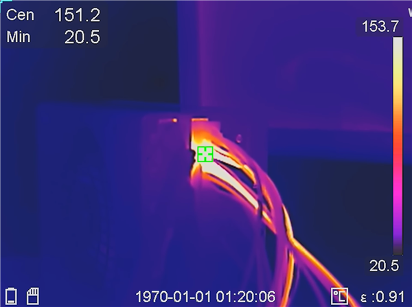 红外成像下可以看到,电源线在显卡接口附近的温度,最高竟然达到了不可思议的151℃,如果长时间运行必然很危险。