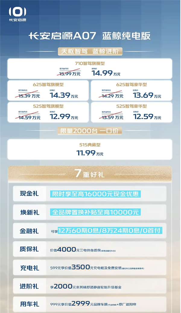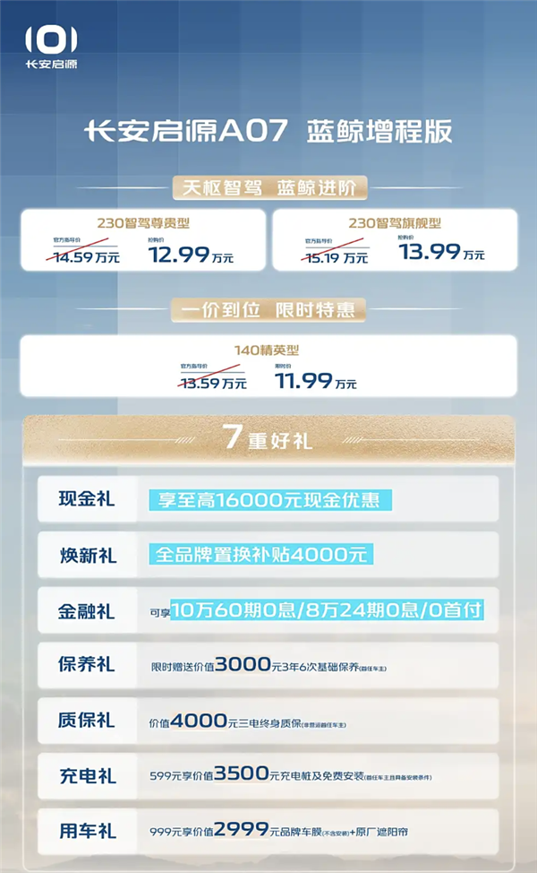快科技2月12日消息,长安启源A07蓝鲸增程版和纯电版正式上市,共推出9款车型,售价范围11.99至14.99万元。