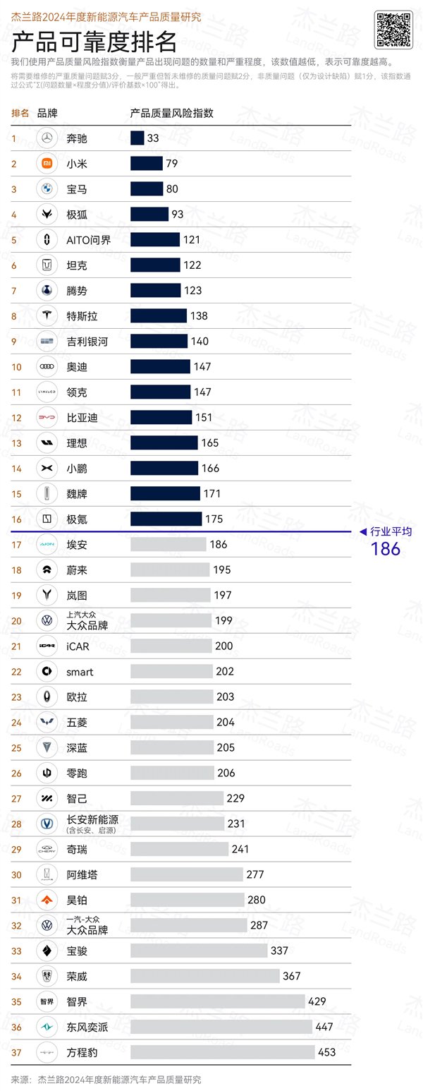 榜单显示,奔驰的产品质量风险指数只有33,为国内新能源车型最低,可靠度位居第一,大幅领先其它品牌。