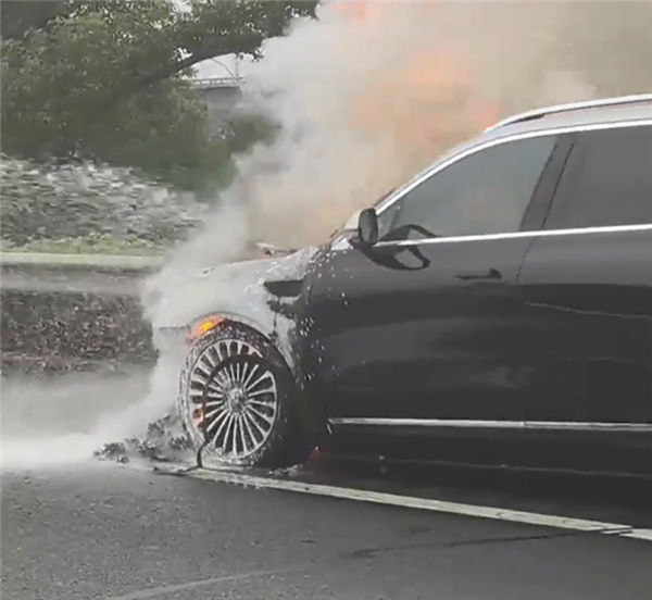 起火车辆应该是出了事故,车头部分损坏严重,大火正是从这部分烧起来,不过整车框架完整,隐藏式门把手已经弹出,据称车上人员事故后已经安全撤离。