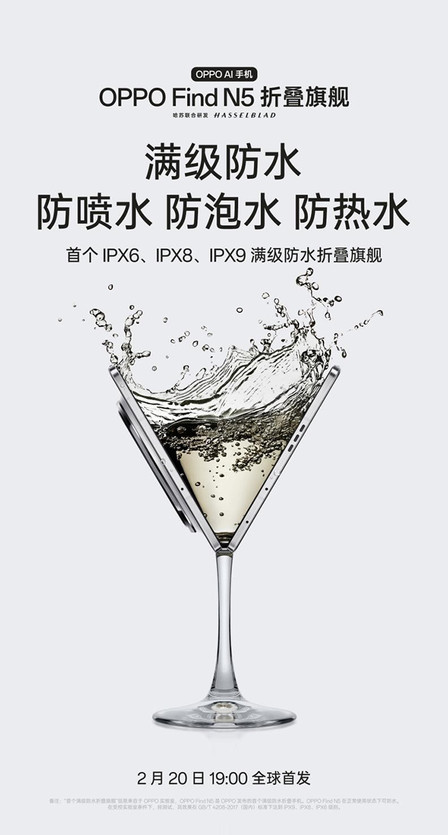 折叠屏手机由于其特殊的产品结构,防水表现一直是困扰业界的巨大难题,而OPPO Find N5成为了业界首个支持IPX6、IPX8、IPX9三种满级防水的折叠屏手机,上述三个防水标准并不是向下兼容的,而是指的不同的防水维度,其中IPX6是防喷水的最高等级,比如日常的雨水、厨房的溅水等而IPX8是防浸水的最高等级,表示设备能在1米深的水下正常工作在30分钟以内,比如水盆、河流等场景;而IPX9是防高温高压喷水的最高等级,比如汗蒸、桑拿等场景。可以说,OPPO Find N5完成了生活遇水场景的全覆盖,有效地解决了消费者的后顾之忧。OPPO Find N5的防水表现之所以如此出色,是因为在产品结构方面实现了全面的创新,更多谜底会在发布会上正式揭晓。