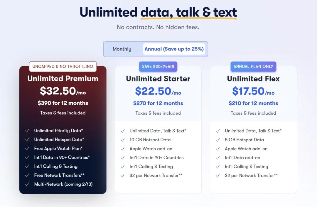 资费方面,US Mobile的Premium套餐月费为32.50美元(年付)或44美元(月付)。