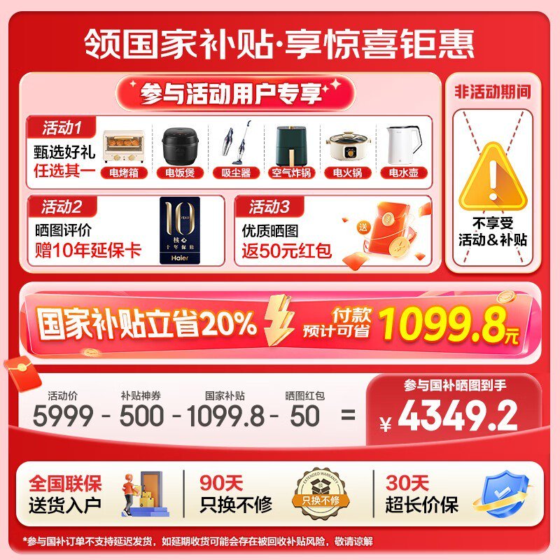 海尔501升法式多门四开门冰箱优惠8%,到手价5499元