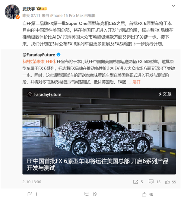 快科技2月12日消息,贾跃亭日前宣布,法拉第第二品牌FX首批Super One原型车亮相CES展会后,首批FX6原型车将于本月由FF中国运往美国总部。