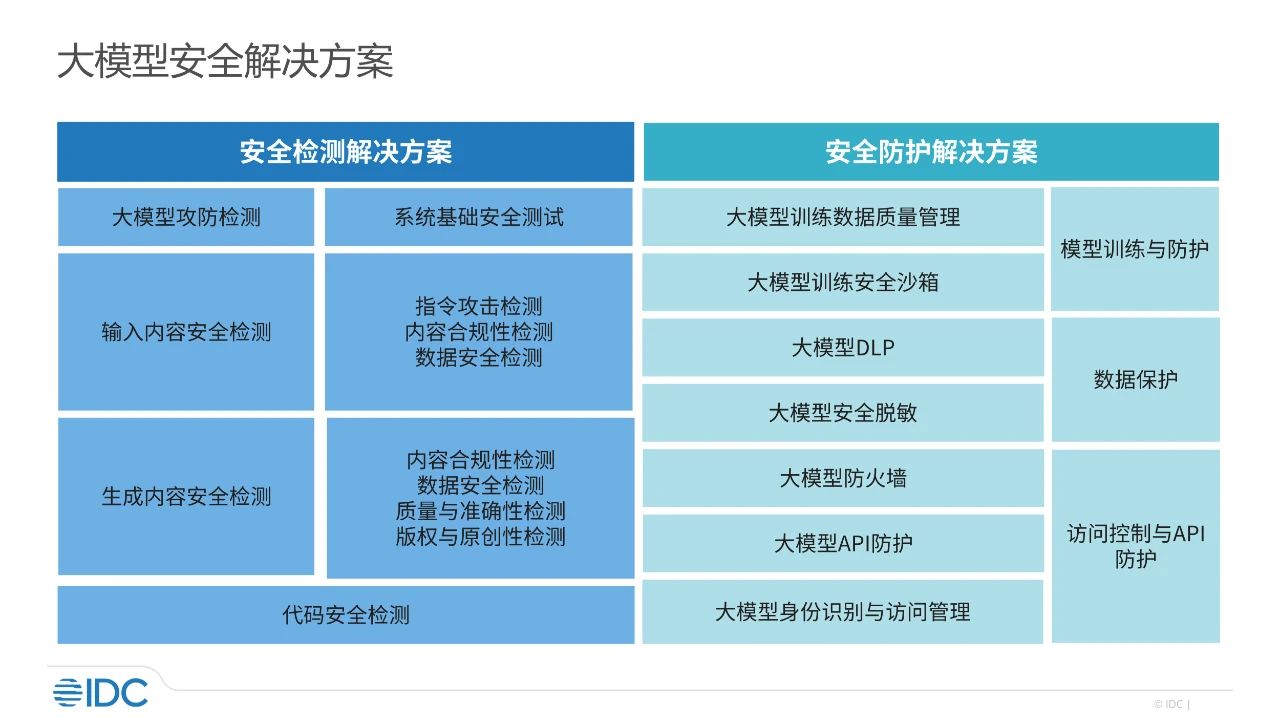 如今,已经有越来越多地网络安全公司和大模型公司将关注重点放在大模型或GenAI工具的安全能力检测以及安全防护的方向上,推出了一系列的针对大模型或GenAI工具的安全检测和安全防护解决方案,这对于人工智能技术在企业侧的深入应用具有重大意义。根据IDC的调研,当前大模型安全检测与防护解决方案包含了大模型攻防检测、输入内容安全检测、生成内容安全检测、代码安全检测、模型训练与防护、数据保护、访问控制与API防护几个大的方面: