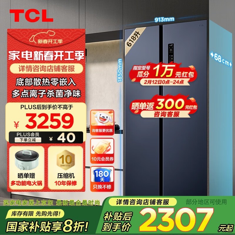 TCL R618T9-SQ对开双开门超薄零嵌冰箱到手2088元