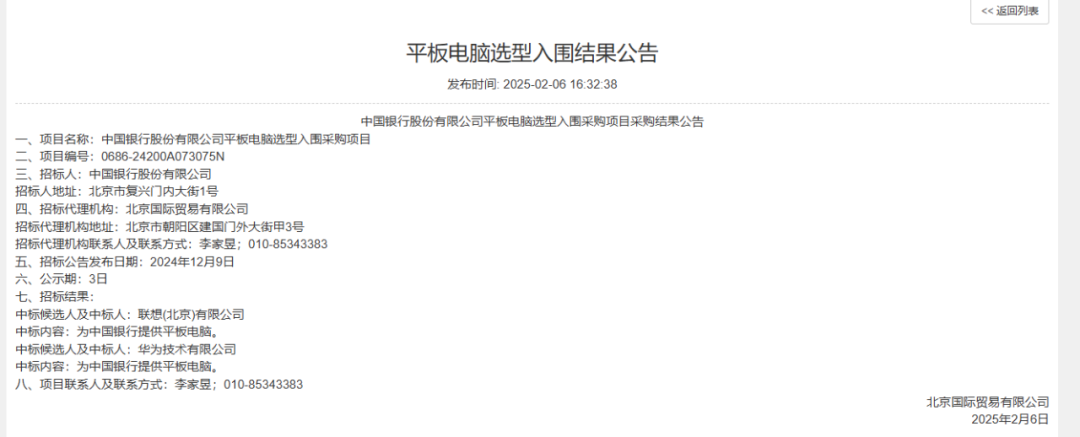 近日,中国银行股份有限公司平板电脑选型入围采购项目结果出炉,联想和华为都是中标人,谁是备选?