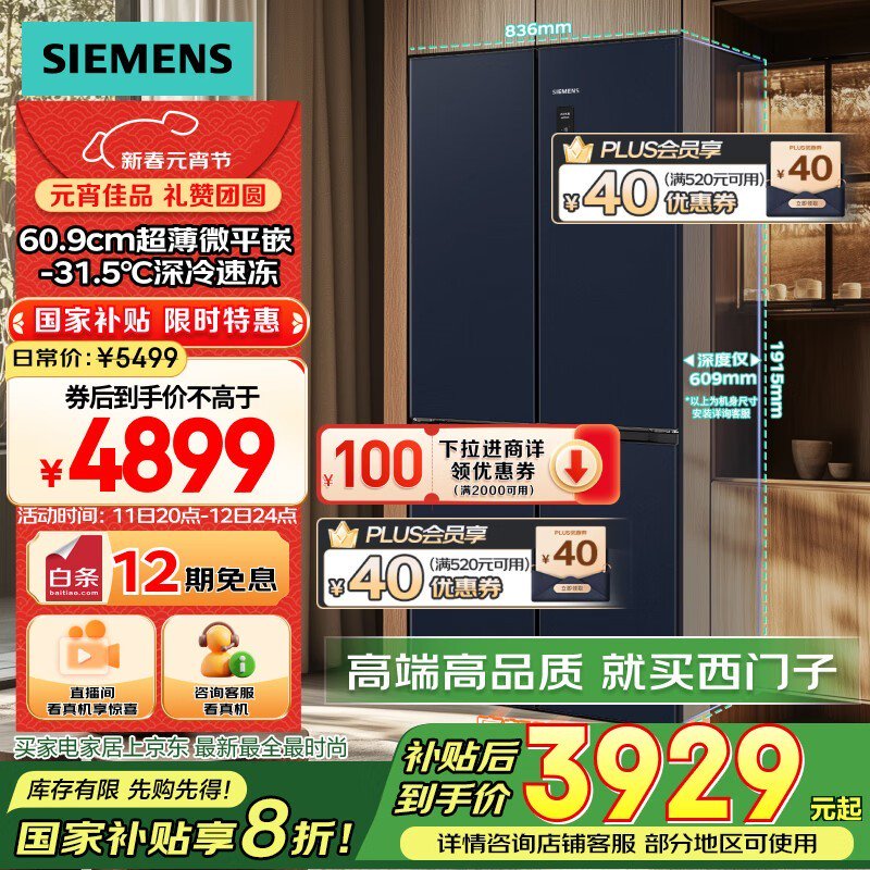 西门子497升超薄微平嵌十字门冰箱:3789元