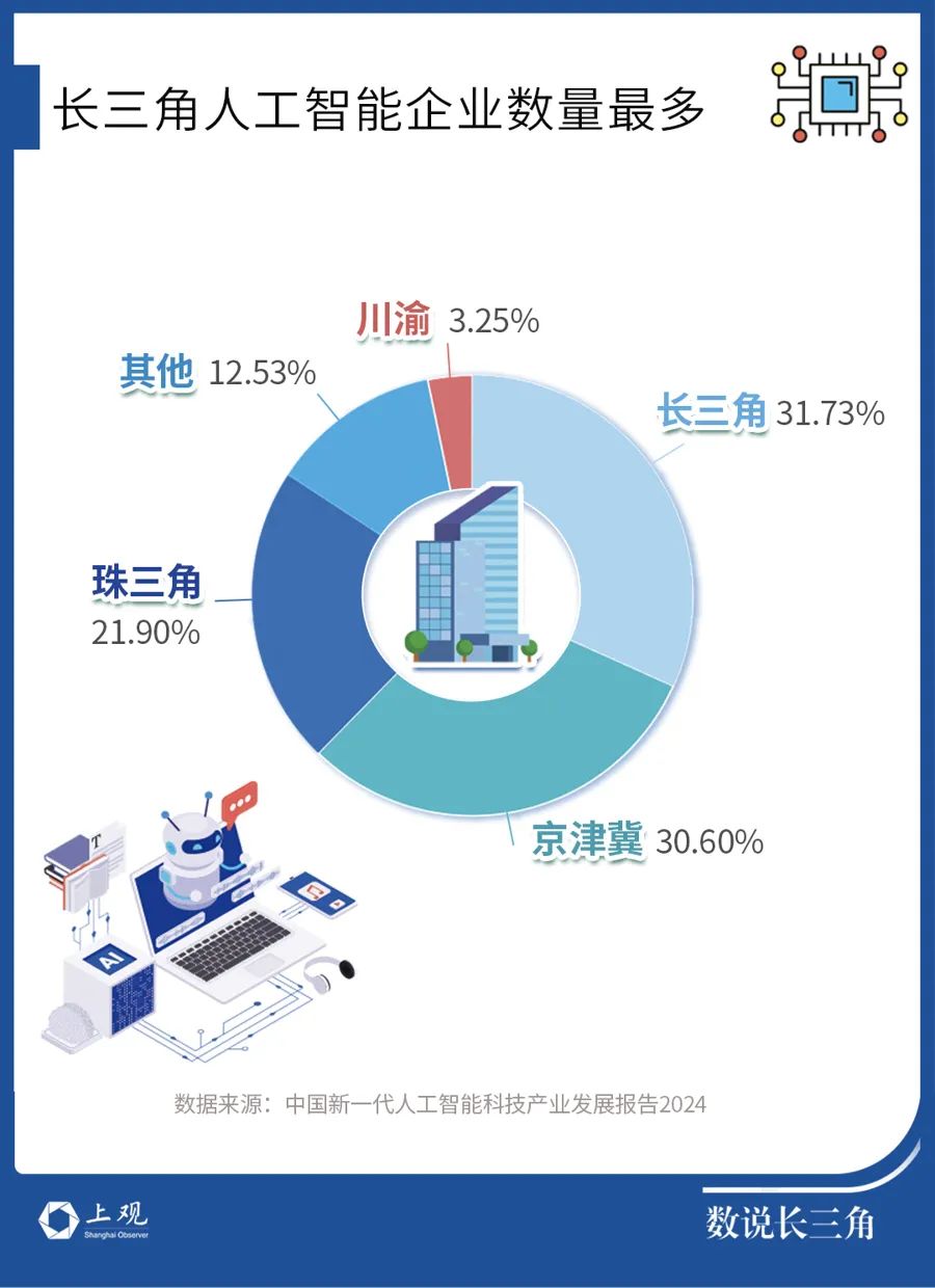 根据《中国新一代人工智能科技产业发展报告2024》,在全国4311家人工智能核心企业的地区分布中,长三角地区以31.73%的占比排名居前。从省份来看,核心企业数量最多的前五个省份中,除北京和广东外,长三角地区占三席,分别是上海、江苏、浙江。