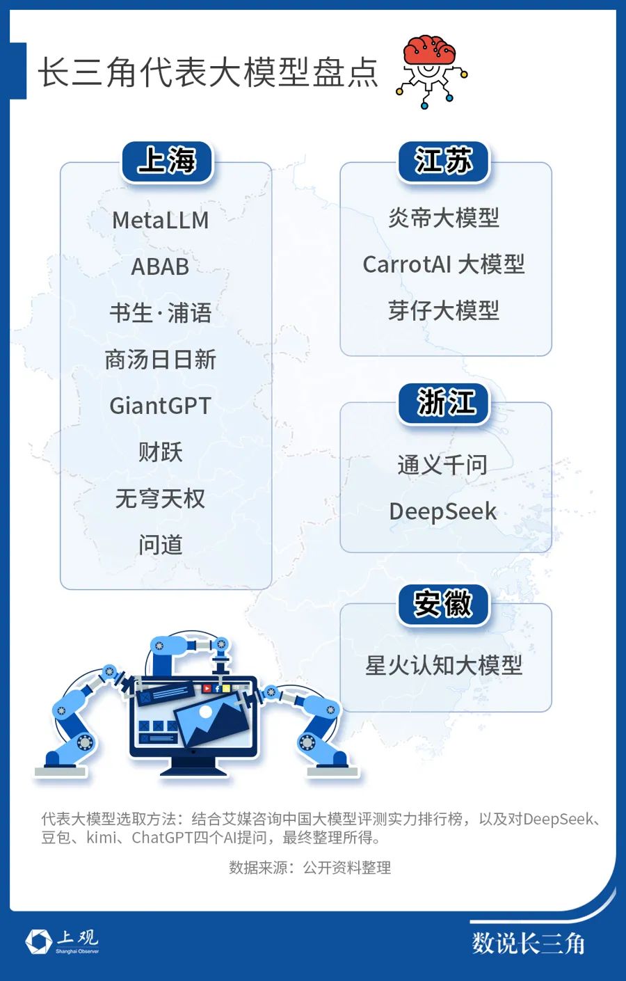 为了回答这个问题,记者分别向DeepSeek、豆包、Kimi、ChatGPT四款AI模型应用提问,要求它们推荐十个注册地为长三角地区、具有代表性的大模型,同时结合艾媒咨询发布的2024年中国大模型评测实力排行榜,综合整理出以下14个最具代表性的长三角大模型,值得注意的是,其中9个为通用大模型。(注:因大模型技术变化日新月异,以下盘点有一定的时间限制和资料搜索限制)
