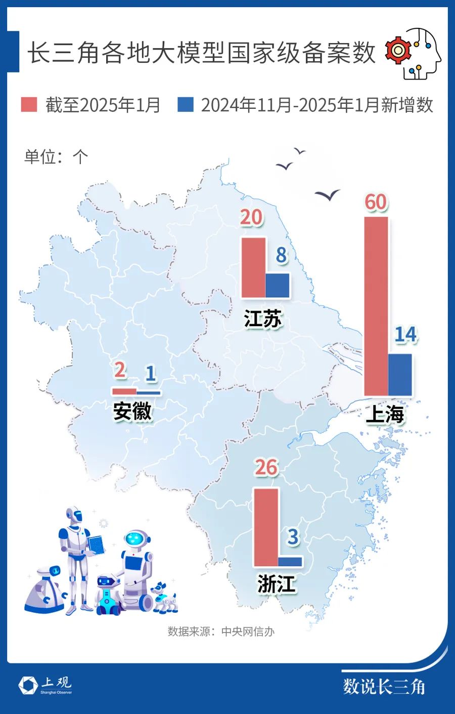 从大模型备案数量来看,长三角也已经驶入了“快车道”。据中央网信办的公示信息,2024年11月后,长三角新增大模型国家级备案26个,其中上海新增14个,江苏新增8个。