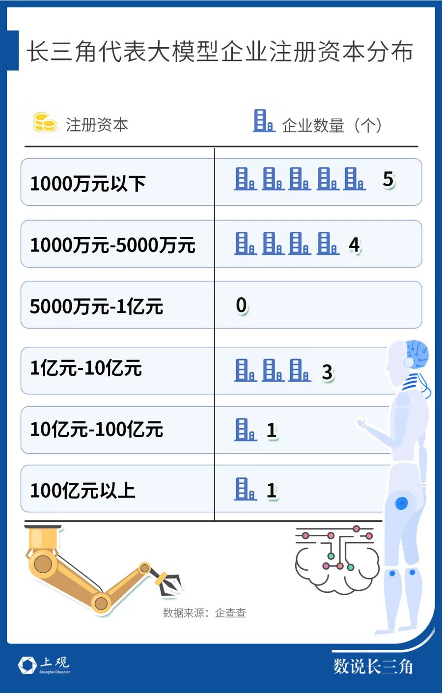 企查查数据显示,全国人工智能相关企业注册资本在5000万元以上的企业仅占比为2.8%。而在长三角这14家模型企业中,有超过三分之一注册资本在1亿元以上。