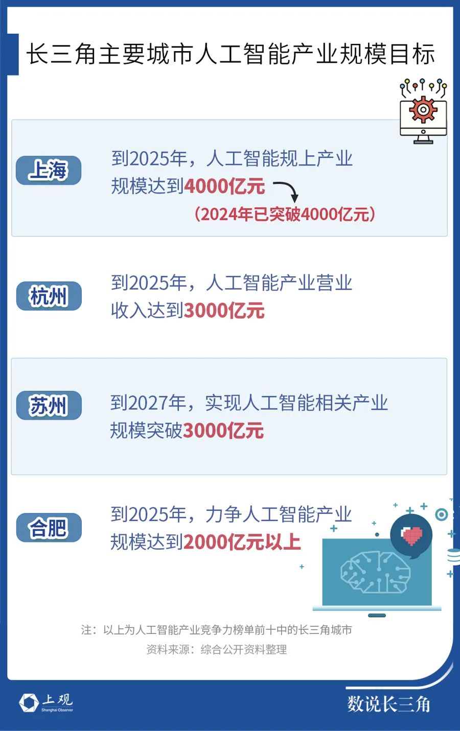 长三角重点城市对人工智能产业规模发展都提出了相应的目标。如上海在《上海市人工智能产业发展“十四五”规划》中曾设立,到2025年上海人工智能规上产业规模达到4000亿元的目标。此外,苏州、合肥等城市也在2025年设立了目标。上海提前宣告完成,给新一年长三角人工智能发展带来了开门红。