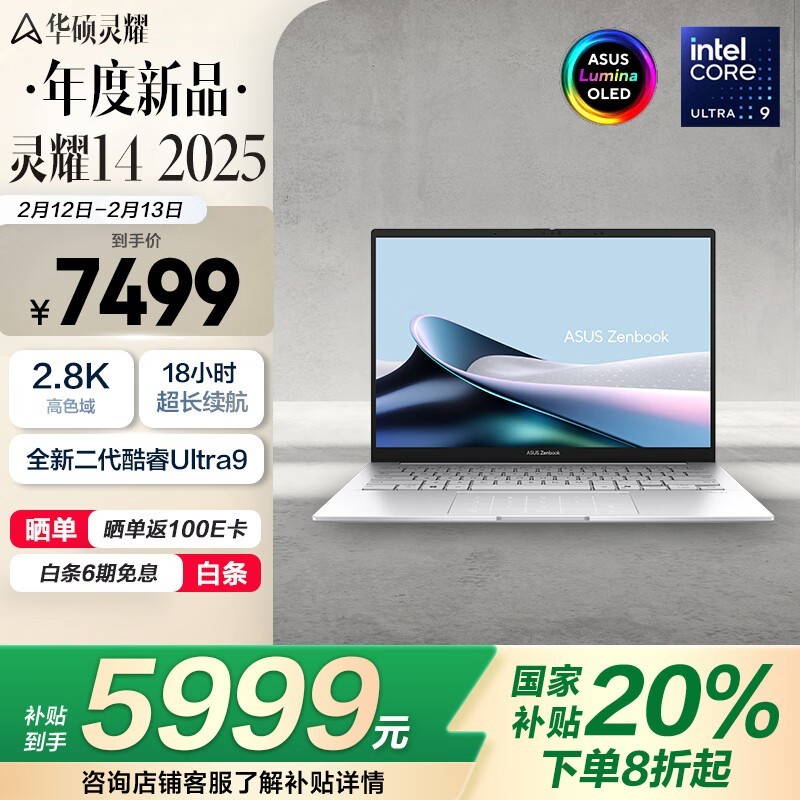 华硕灵耀14 2025 二代酷睿Ultra版轻薄本仅售5873元