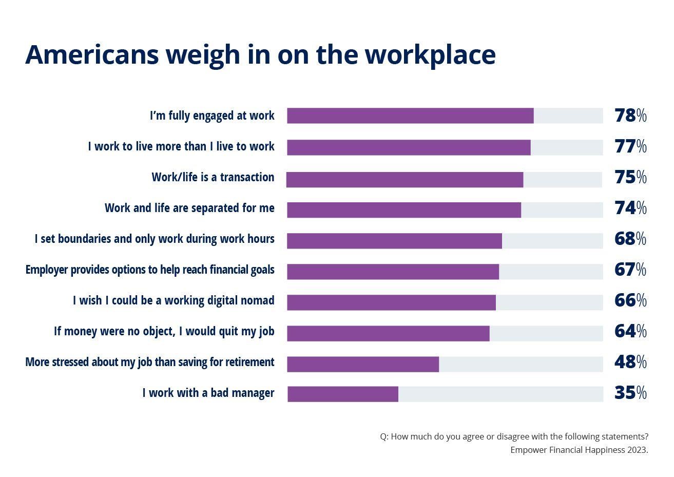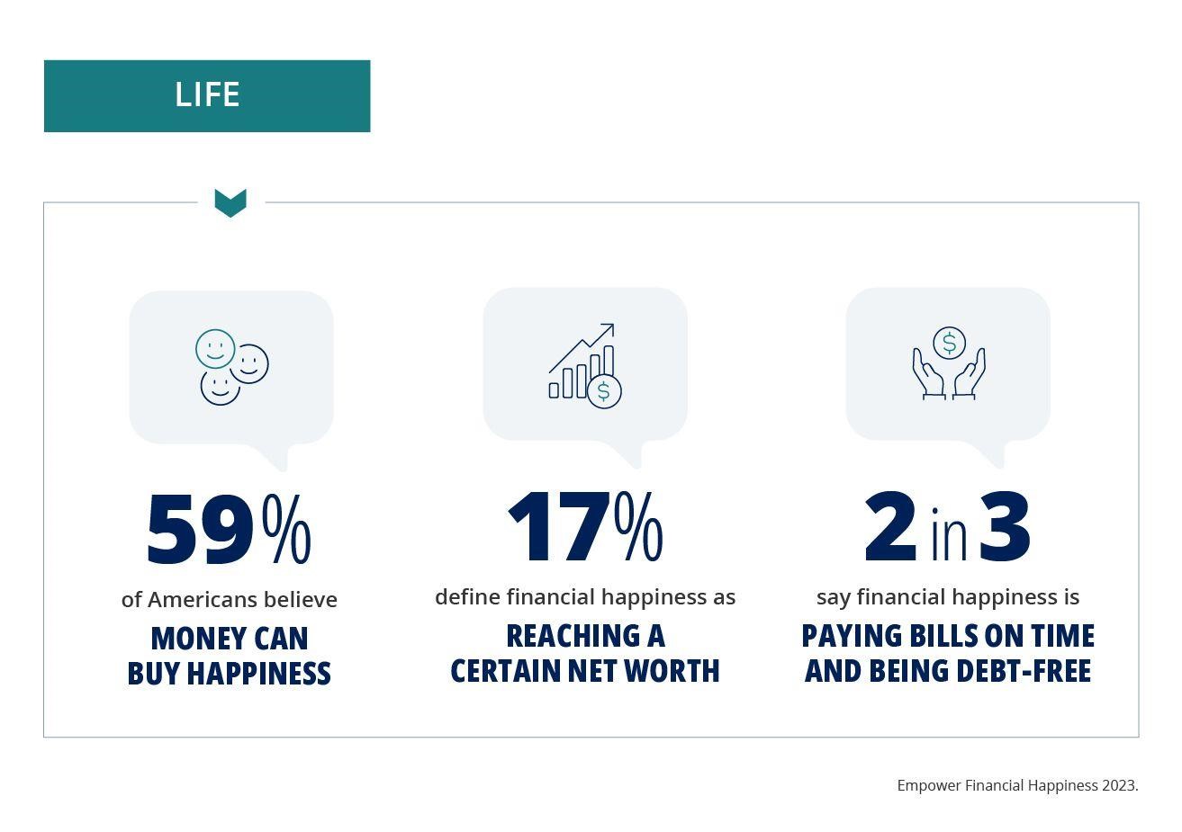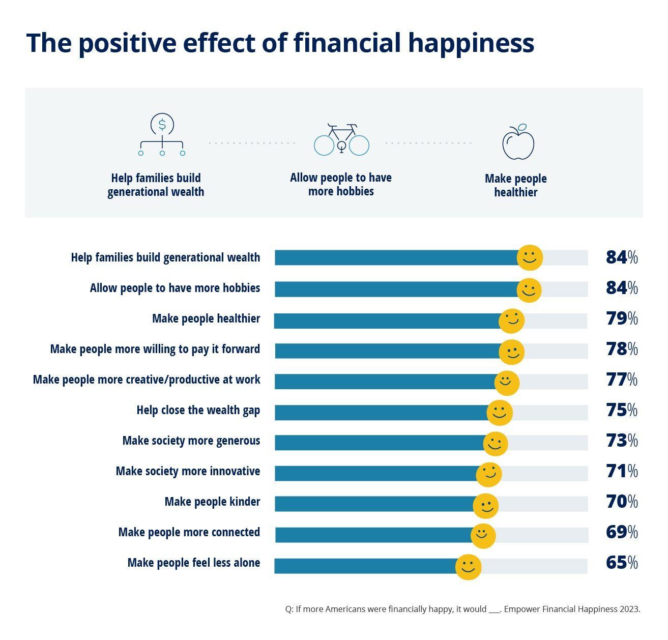 美国人认为,经济上的幸福可以对许多衡量美好生活的指标产生变革性的影响:工作上的成就感和生产力(77%)、代际财富(84%)、激发更大的创新(71%)、促进整体健康(79%)。