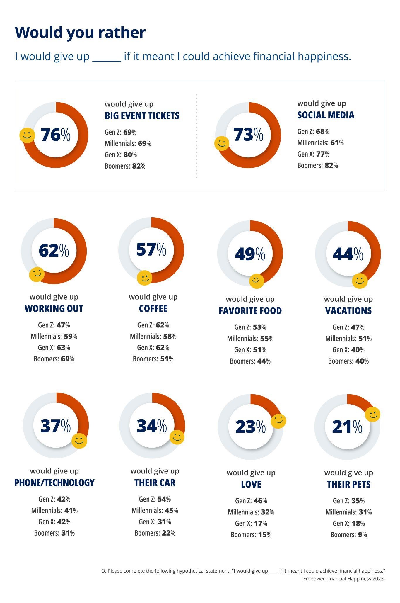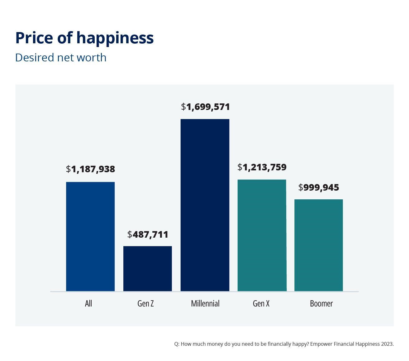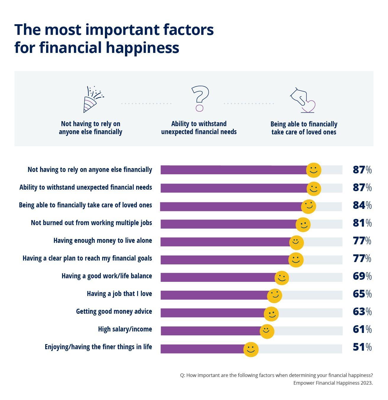 独立、适应能力和慷慨与财务幸福感密切相关:大多数人表示,当他们在经济上不需要依赖任何人(87%)、能够承受意外的财务需求(87%)或能够在经济上照顾亲人(84%)时,他们就会知道自己已经达到了财务幸福感。