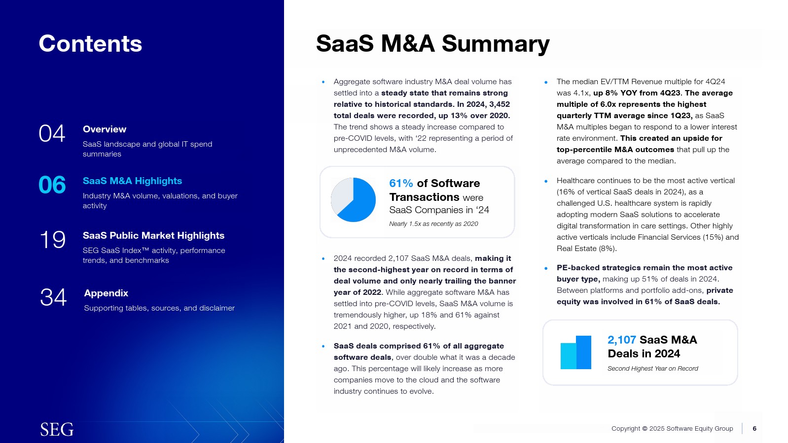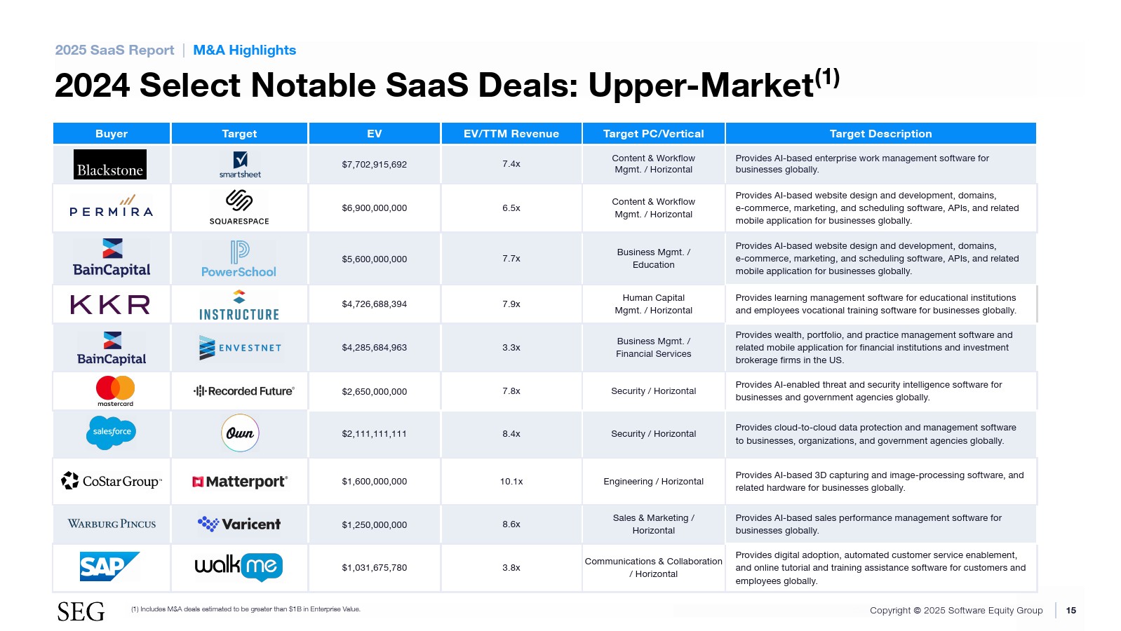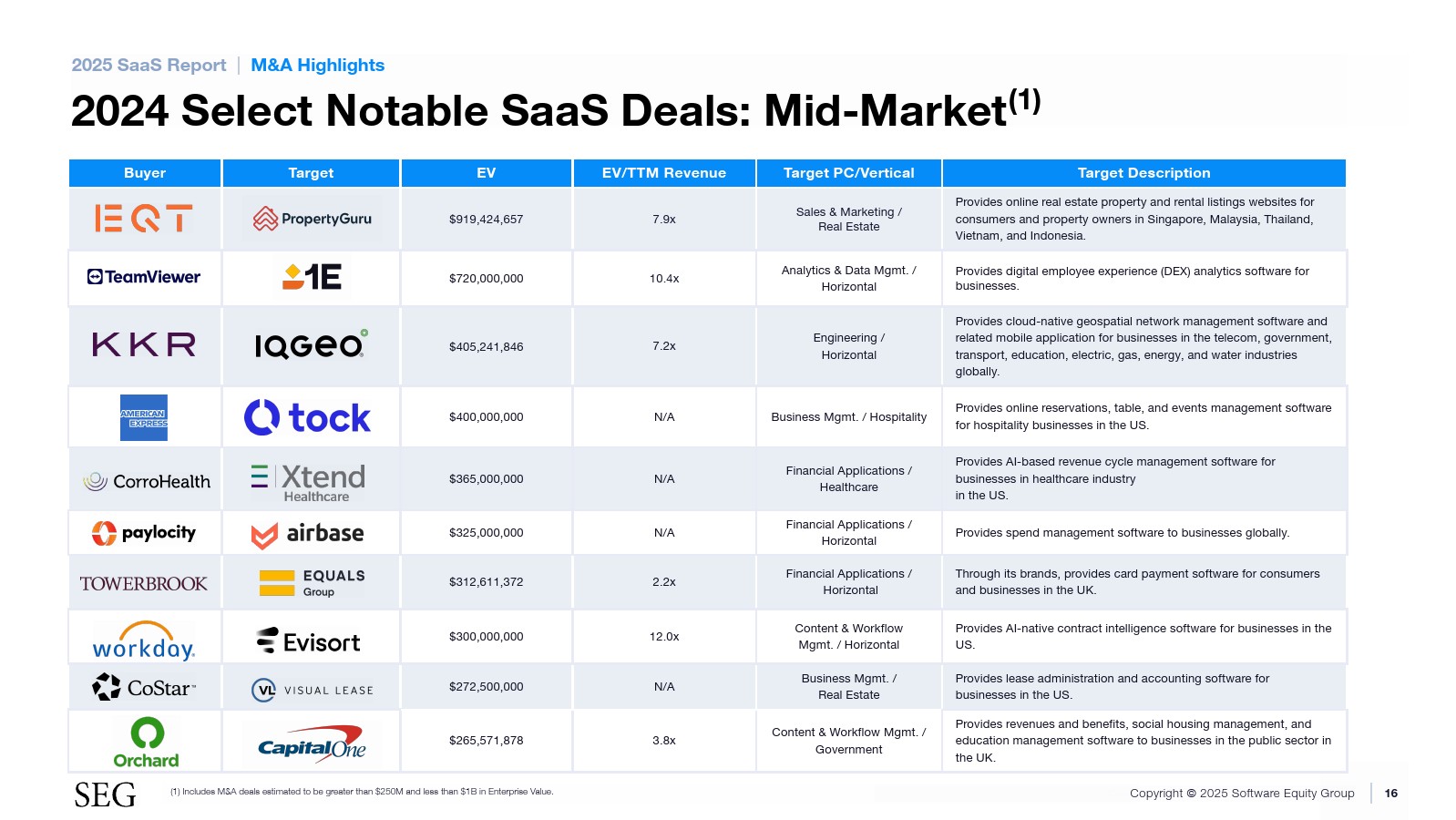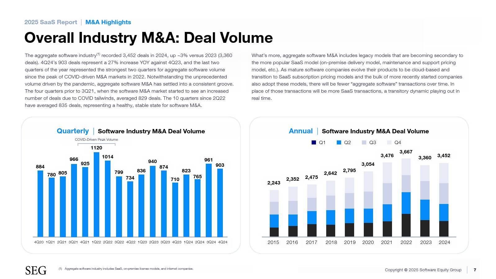 SEG SaaS指数从去年10月下跌12%反弹了15%,2024年底上涨了3%。在并购方面,2024年SaaS交易超过2100笔,成为SaaS并购第二活跃的年份,仅略落后于2022年。