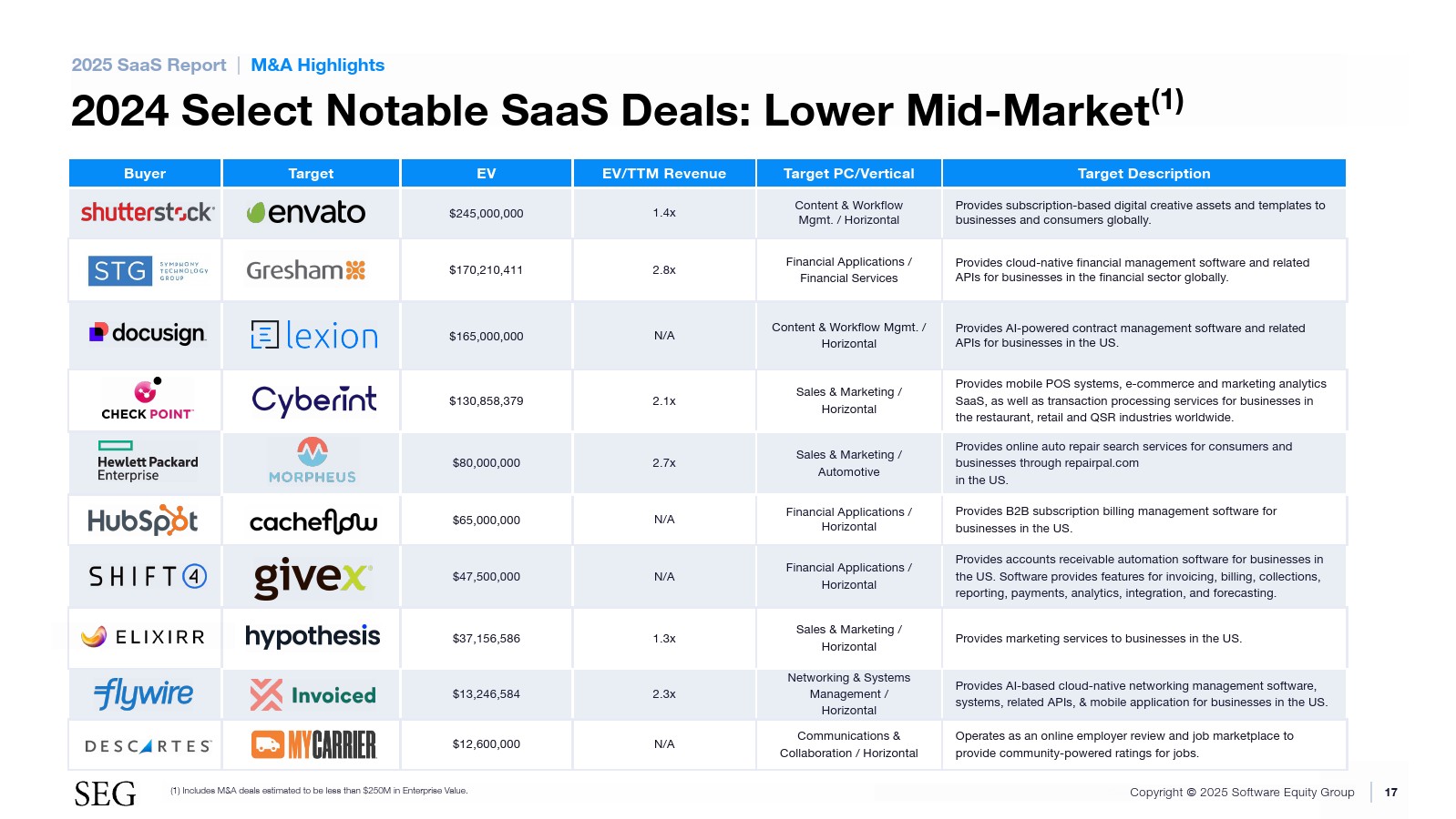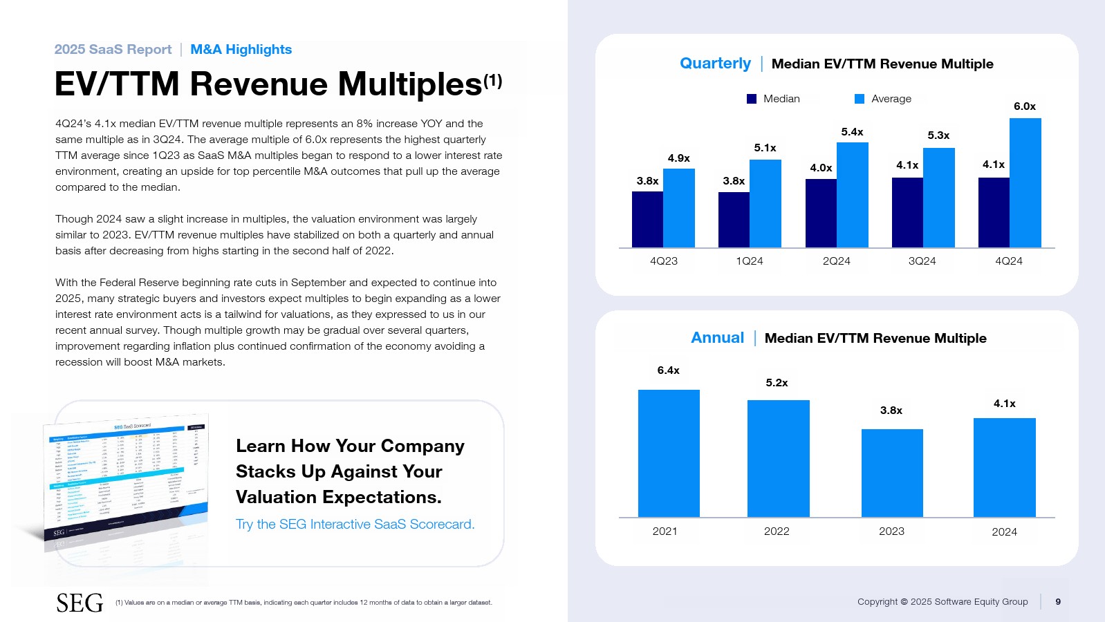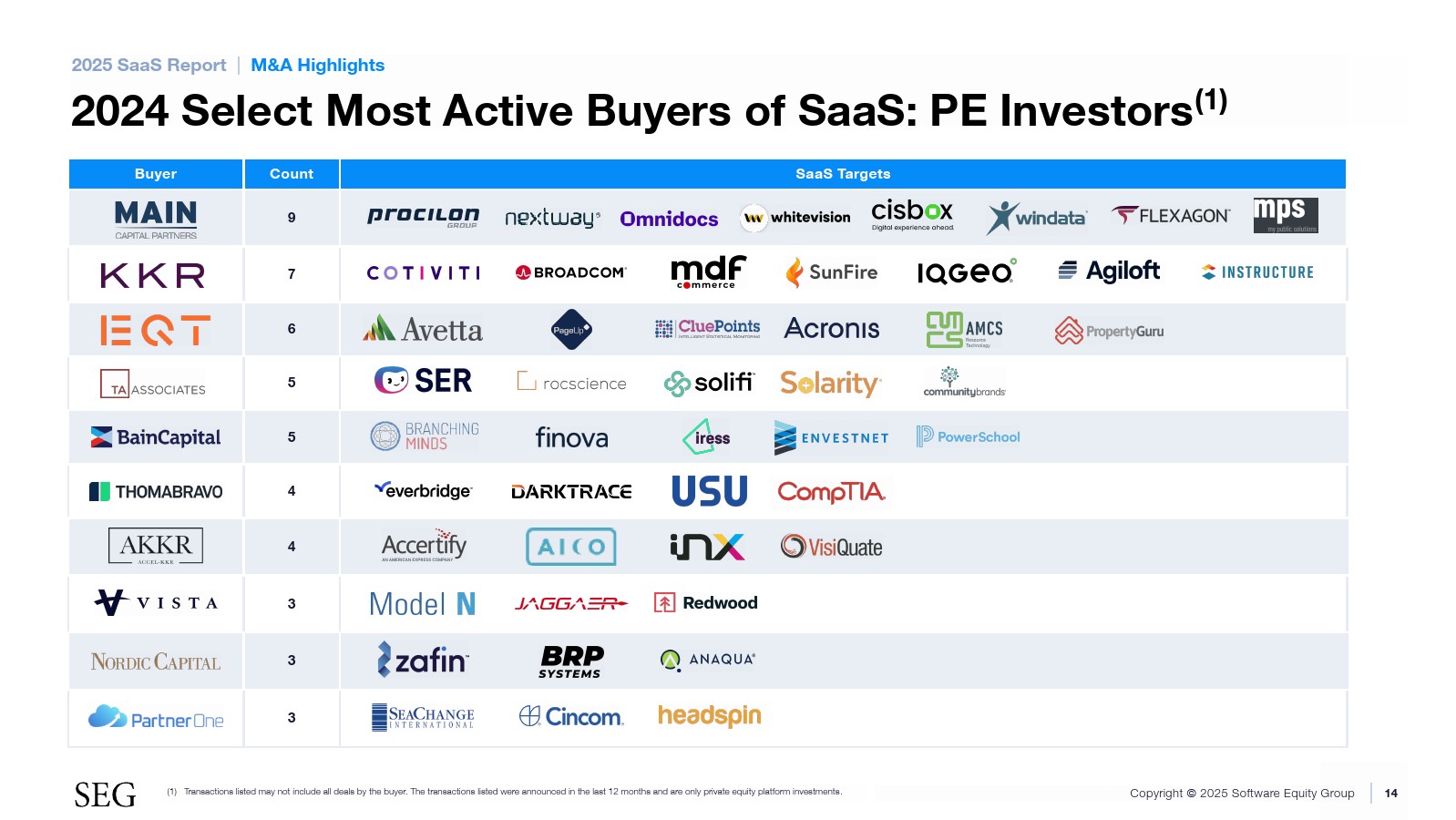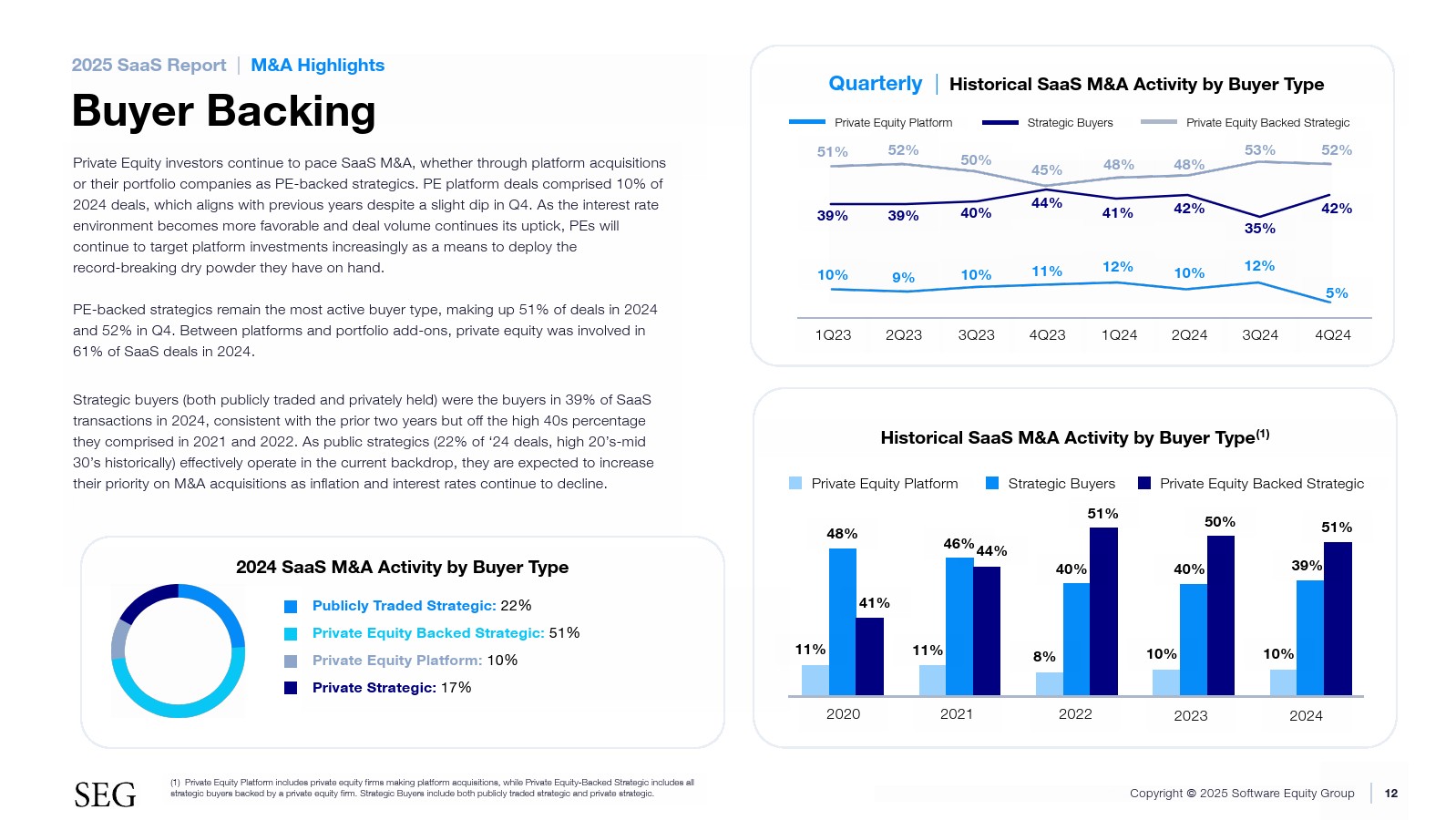 SEG SaaS指数从去年10月下跌12%反弹了15%,2024年底上涨了3%。在并购方面,2024年SaaS交易超过2100笔,成为SaaS并购第二活跃的年份,仅略落后于2022年。