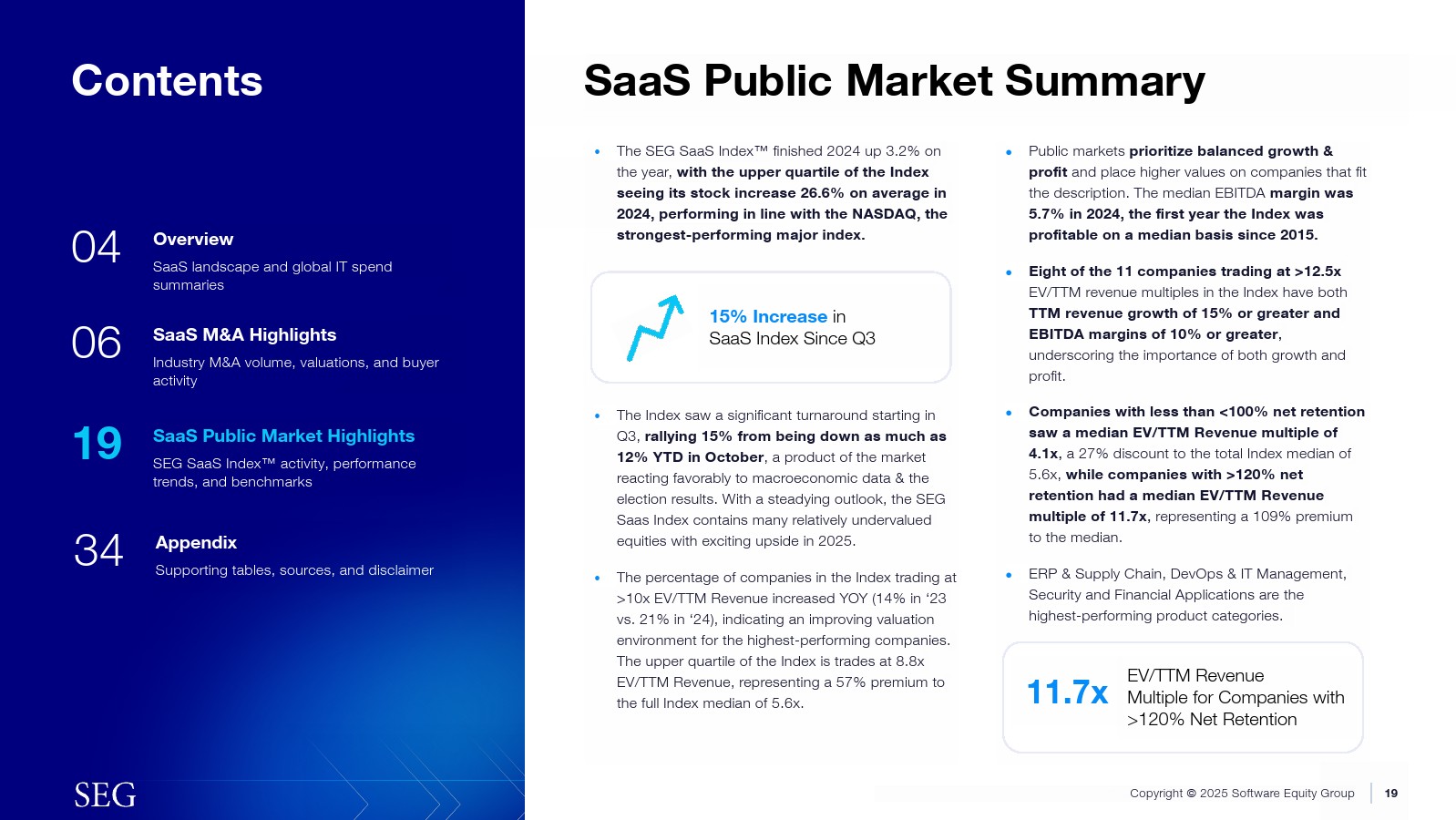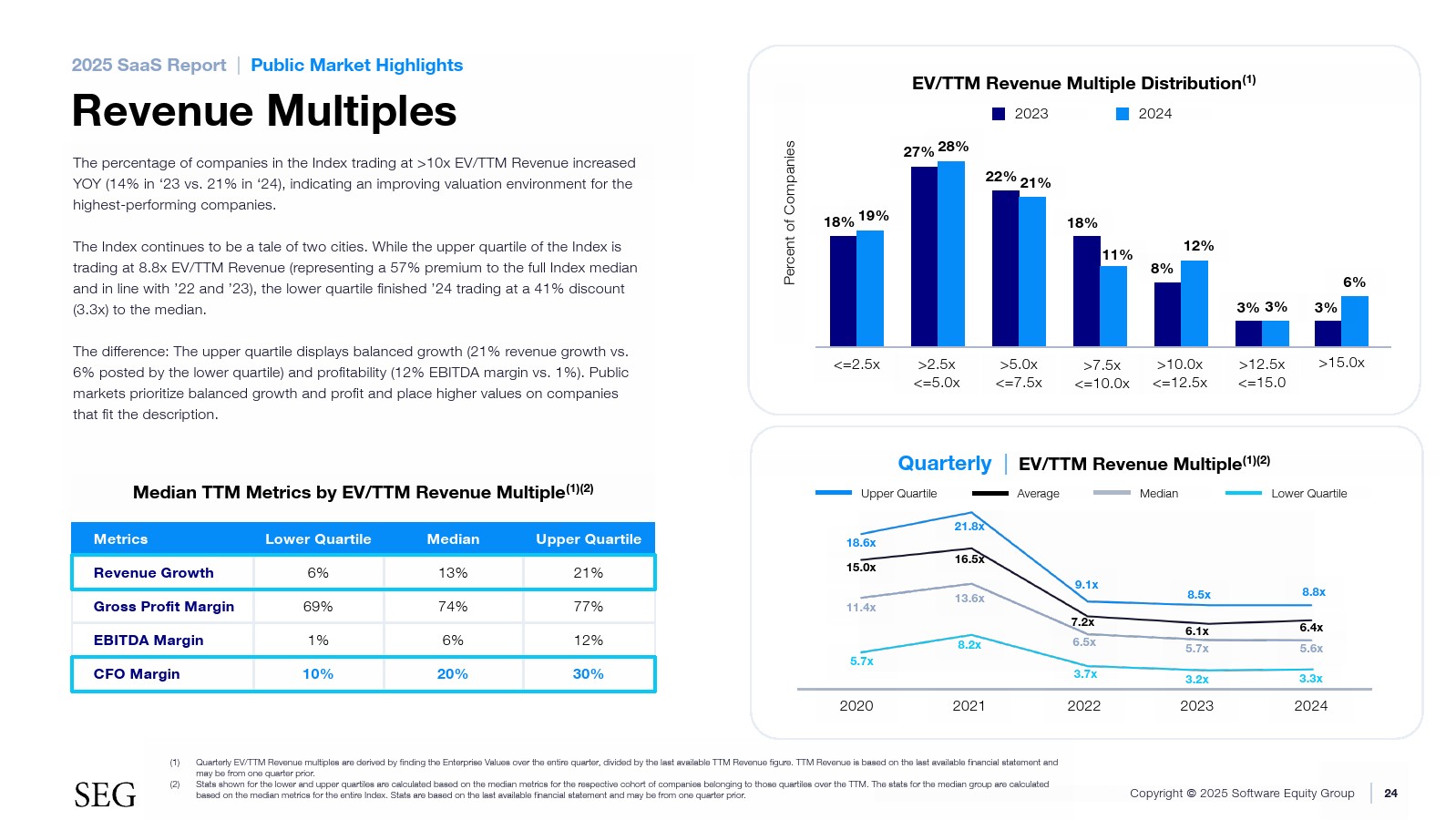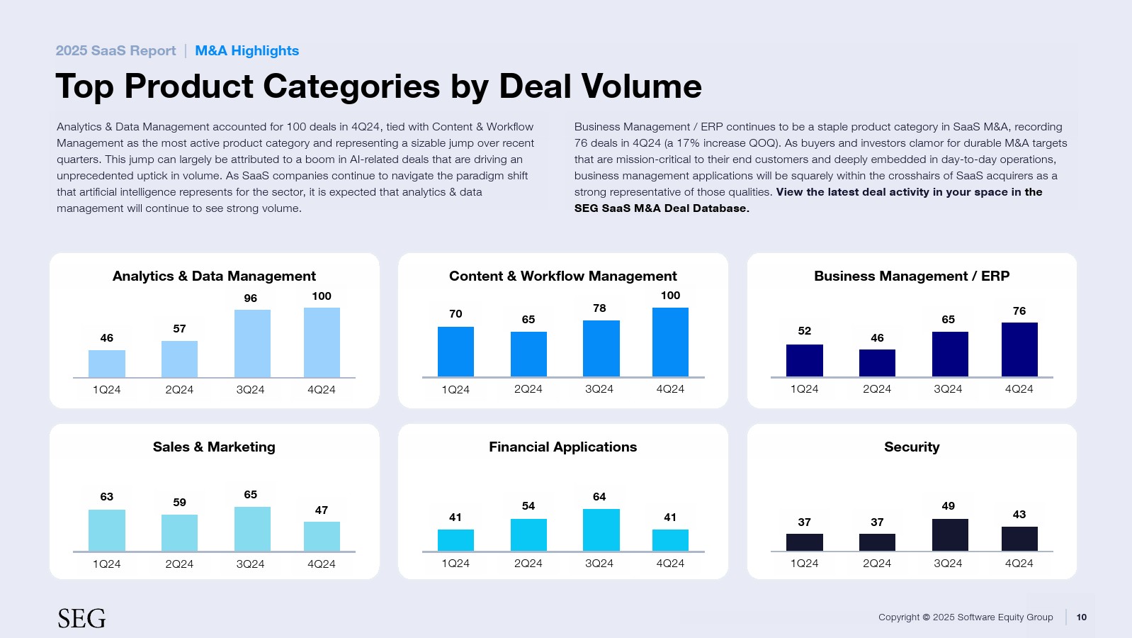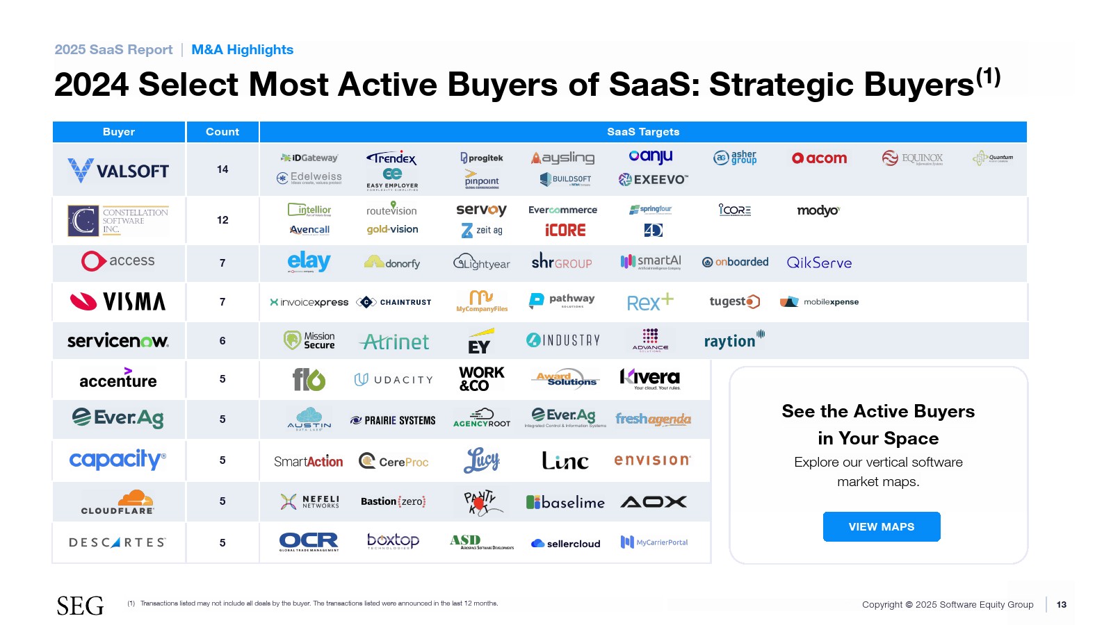 SEG SaaS指数从去年10月下跌12%反弹了15%,2024年底上涨了3%。在并购方面,2024年SaaS交易超过2100笔,成为SaaS并购第二活跃的年份,仅略落后于2022年。