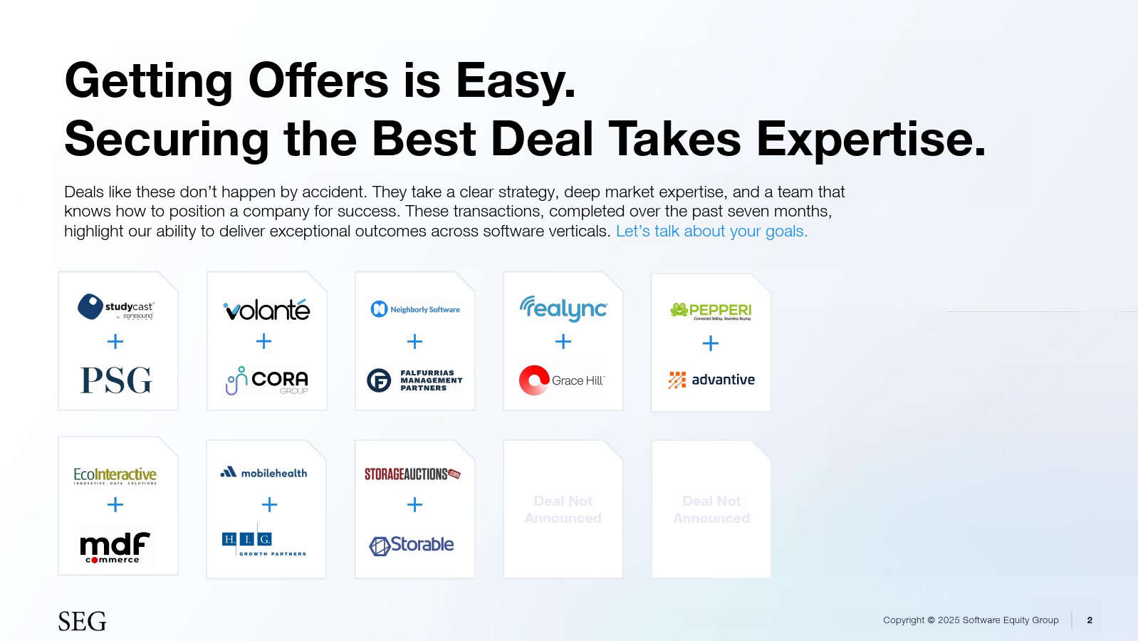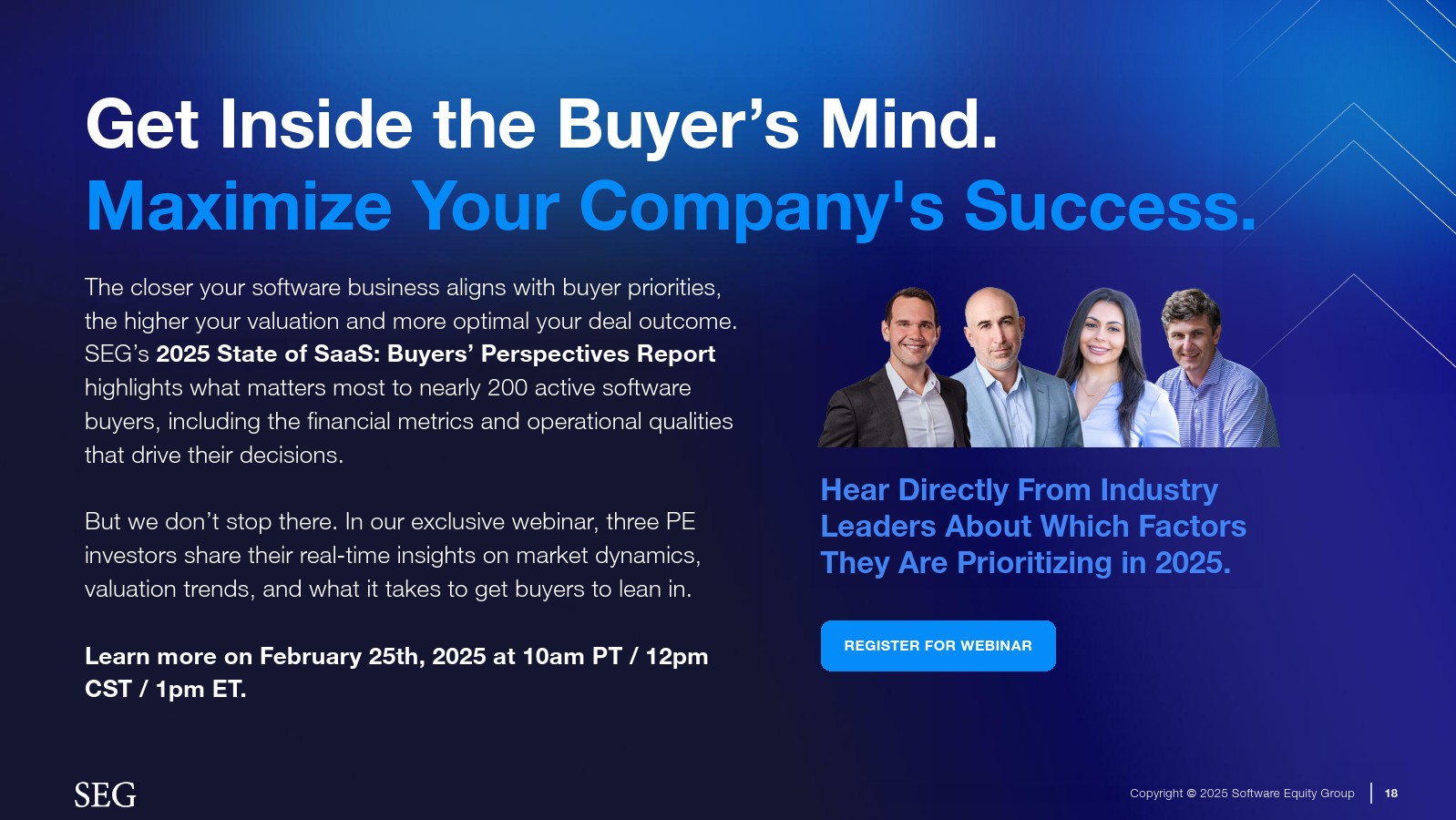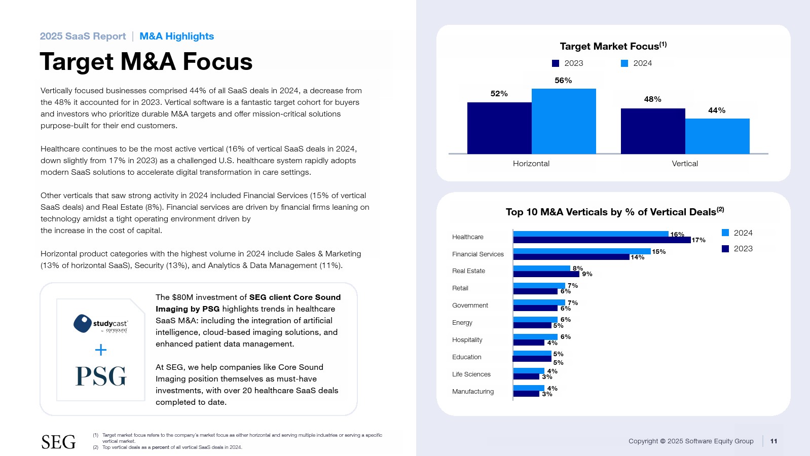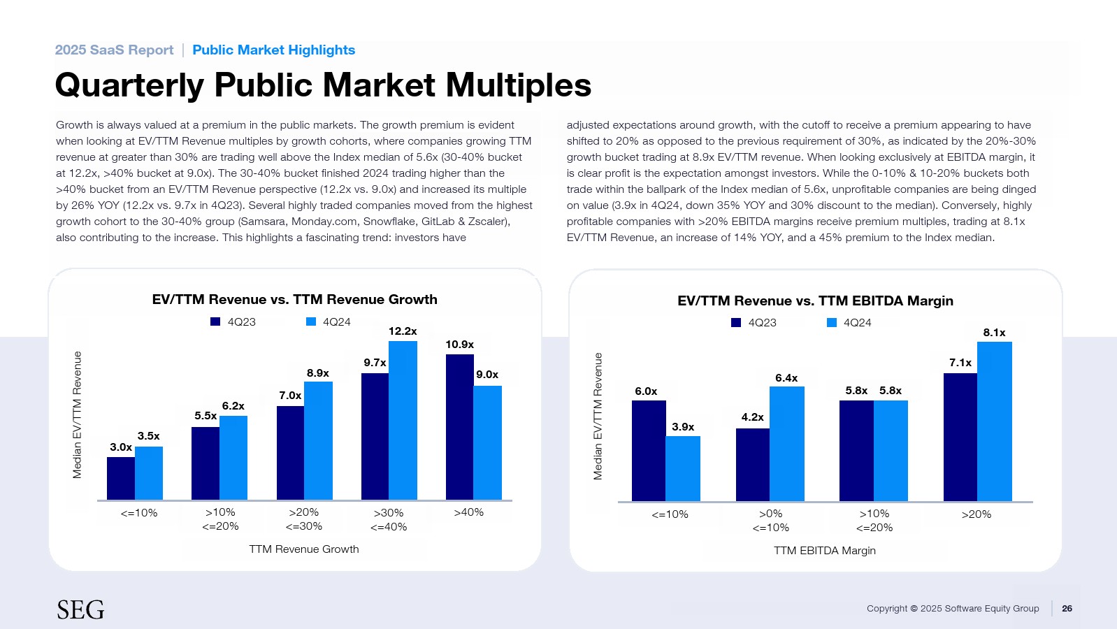 SEG SaaS指数从去年10月下跌12%反弹了15%,2024年底上涨了3%。在并购方面,2024年SaaS交易超过2100笔,成为SaaS并购第二活跃的年份,仅略落后于2022年。