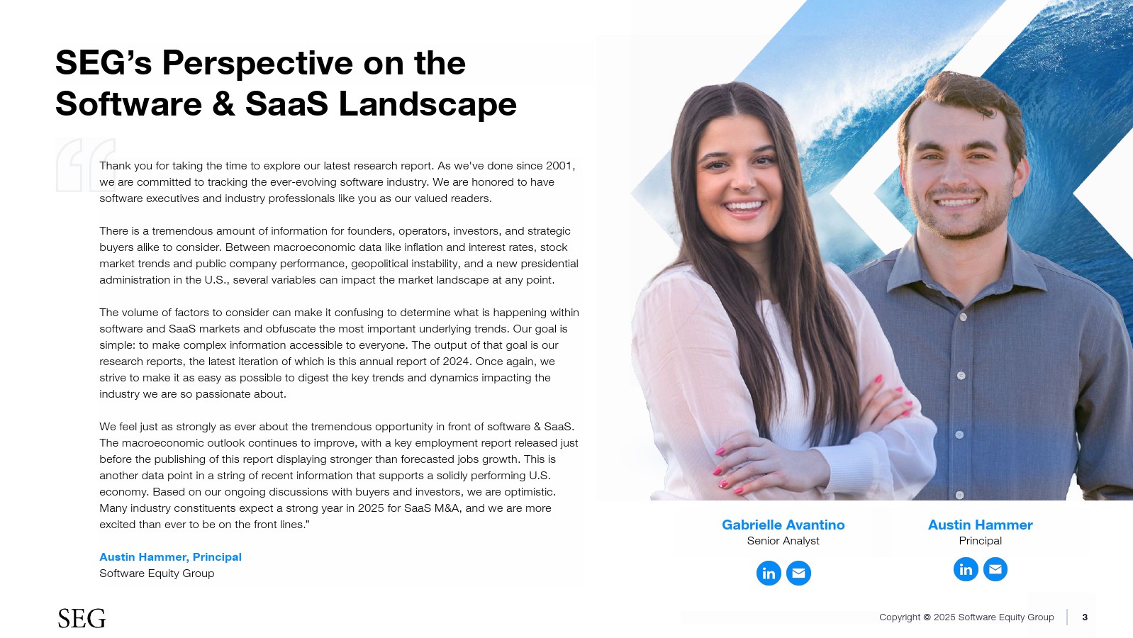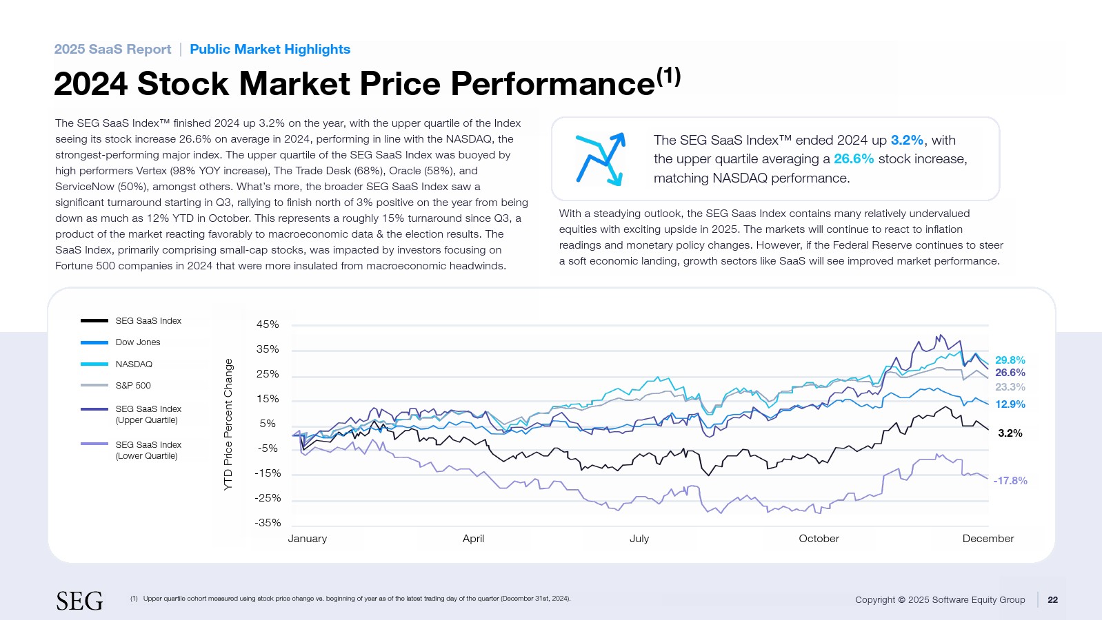 SEG发布了“2025年SaaS报告”。软件产业处于2025年强劲增长的黄金位置。作为一个成长型行业,软件比其他行业更容易受到高利率和通货膨胀的影响。尽管存在这些不利因素,SaaS公司仍然继续占据上风。