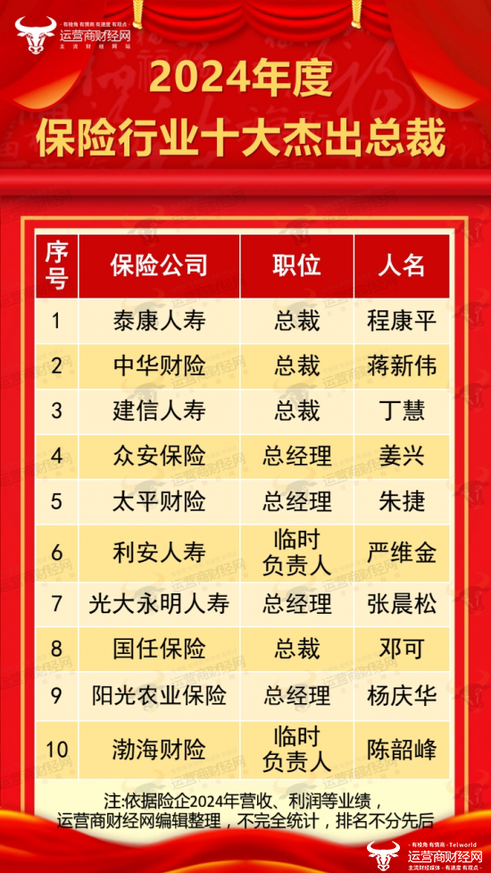 保险行业作为金融行业的一个重要组成部分,其发展动态备受关注。由此,运营商财经网基于对保险行业的整体洞察,独家推出“2024年度保险行业十大杰出总裁”榜单,旨在以此折射2024年保险行业的发展情况。下面,运营商财经网将揭秘该榜单的上榜名单。