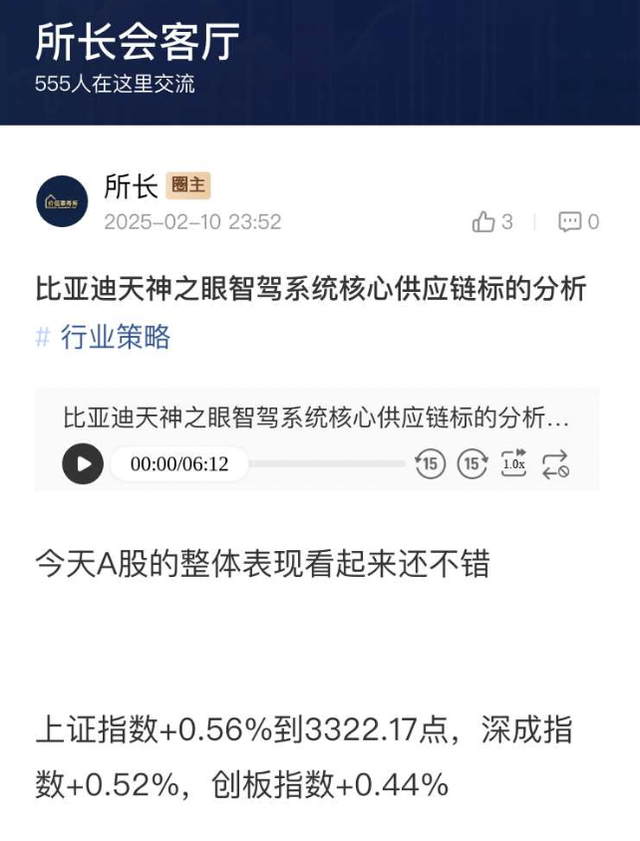今天我们来学习一下《所长会客厅》2025年2月10日的文章——“比亚迪天神之眼智驾系统核心供应链标的分析”,前面是当天行情复盘,这里就省去了直接讲正题。今天要讲的比亚迪供应链也有我们一直努力追踪的韦尔股份。