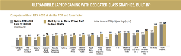 按照AMD的说法,Radeon 8060S已经超过了满血版的移动版RTX 4060,甚至超过功耗释放受限的移动版RTX 4070 Max-Q。