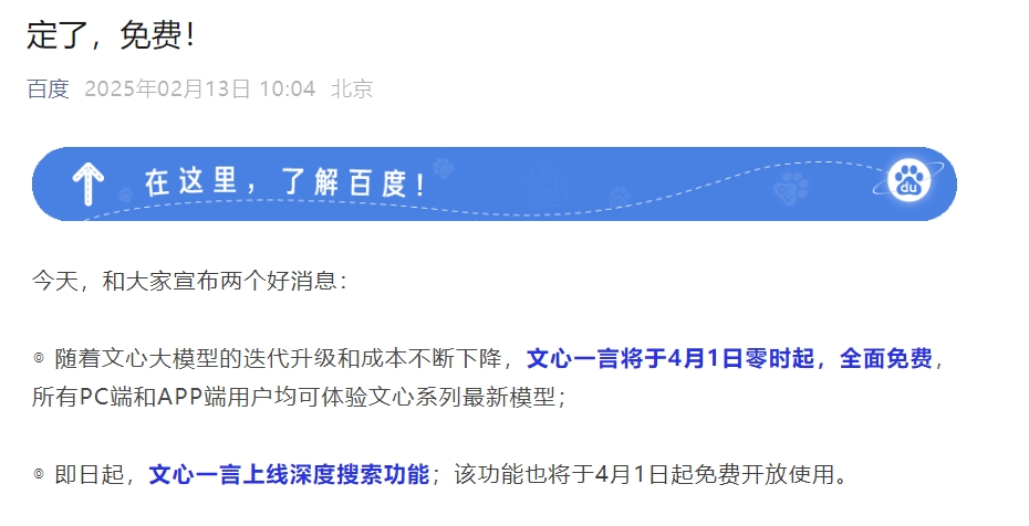 据百度官方公众号,随着文心大模型的迭代升级和成本不断下降,文心一言宣布将于4月1日零时起,全面免费,所有PC端和APP端用户均可体验文心系列最新模型。此外,即日起,文心一言上线深度搜索功能,该功能也将于4月1日起免费开放使用。