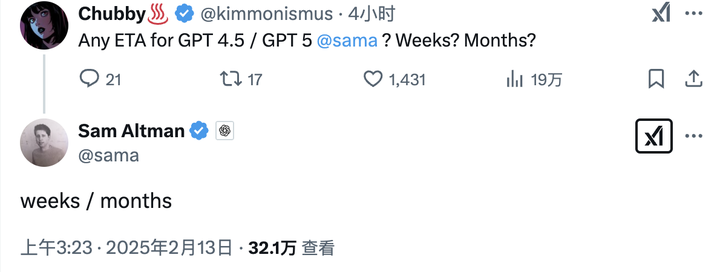 当被网友问及 GPT-4.5/GPT-5 具体发布日期时,Altman 表示将在数周或数月内推出。